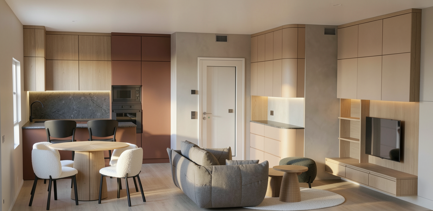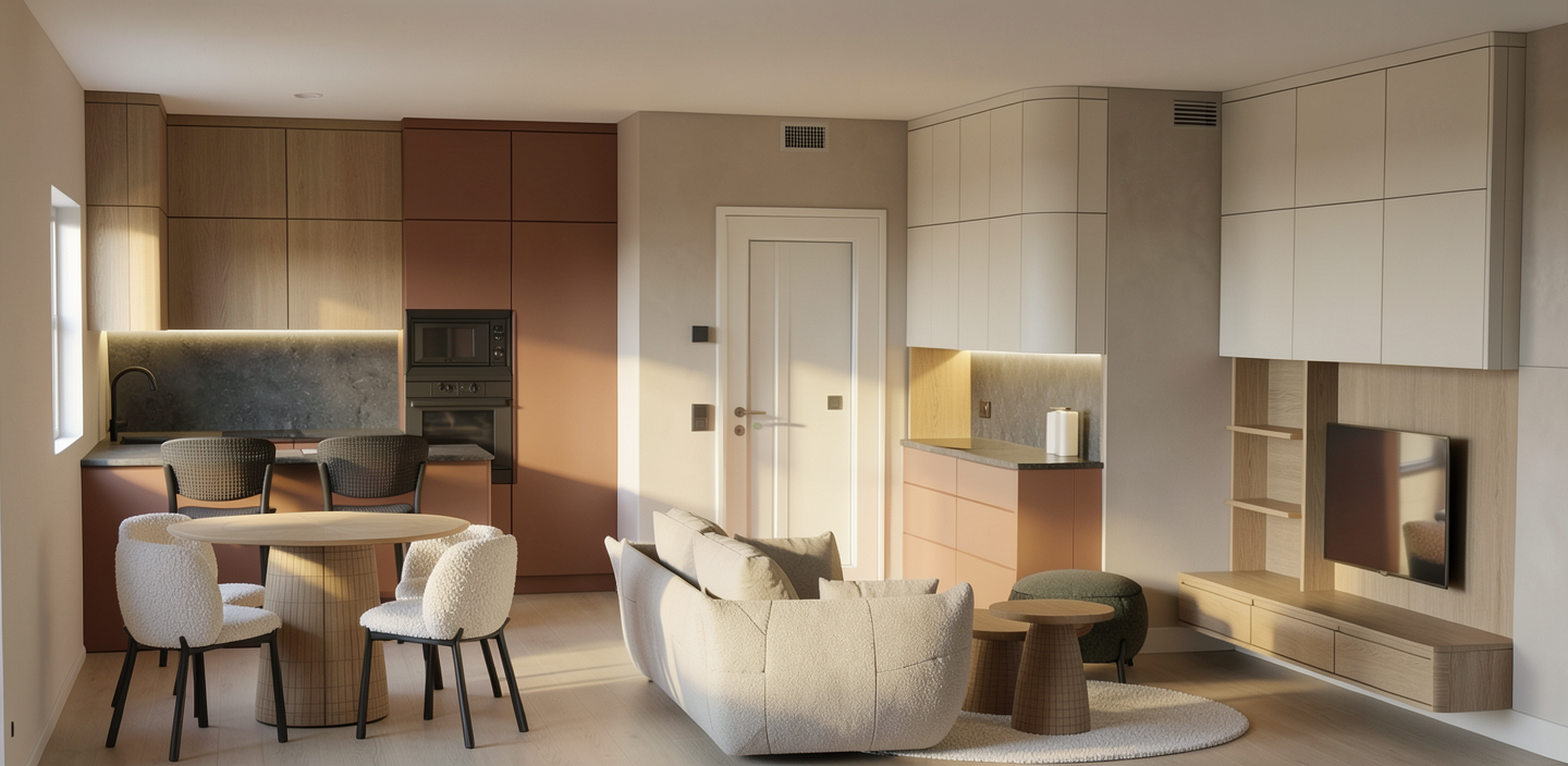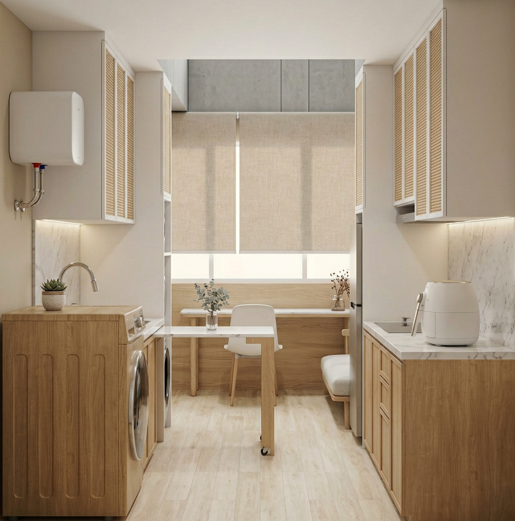 the rendering looks real and natural with a japandi style concept without changing the material shape and size of the image white ceiling light beige wall white window with beige roller blind white marble in top table and backplash kitchen cream wood vinyl floor wooden kitchen lower cupboard white kitchen upper cupboard with woven wooden doors
