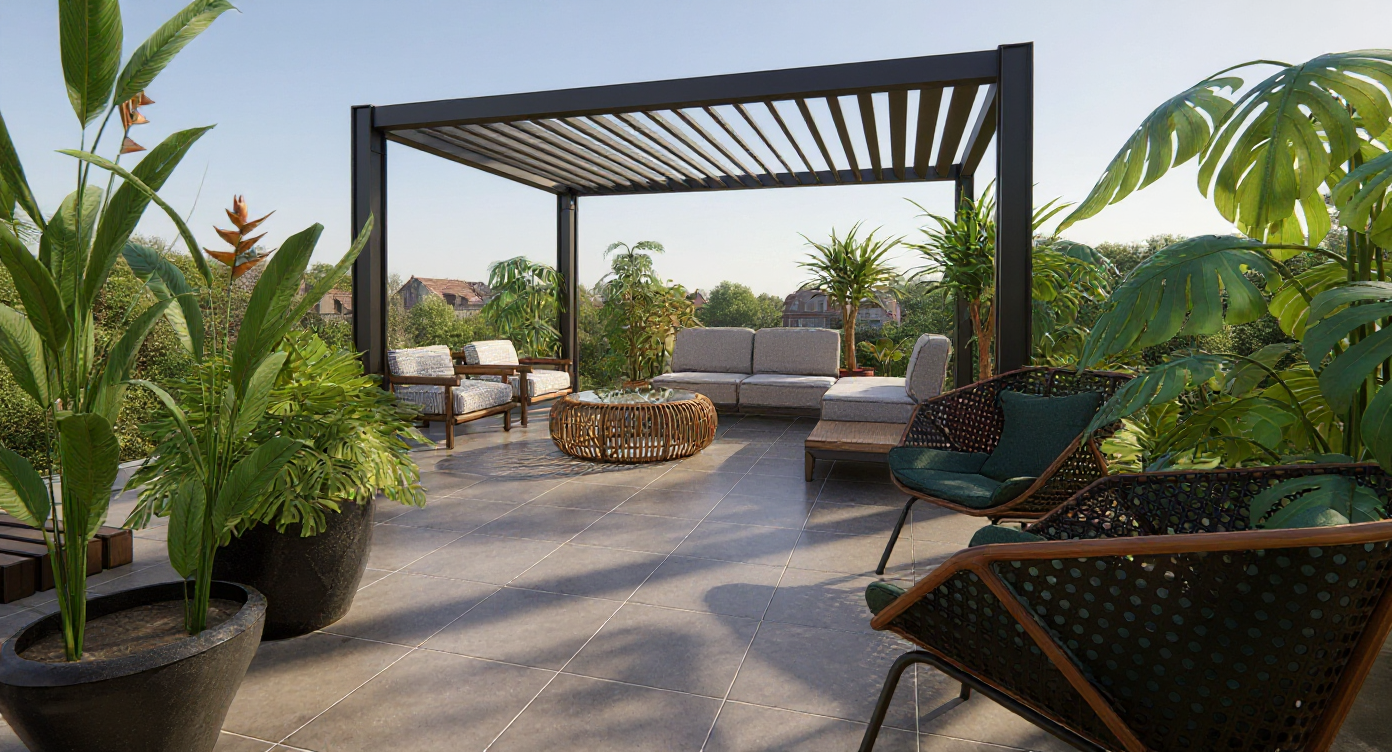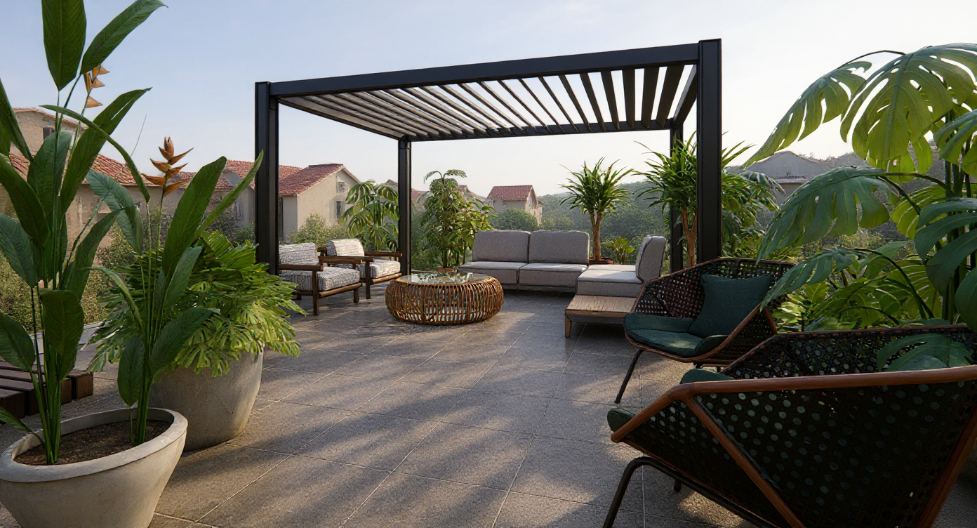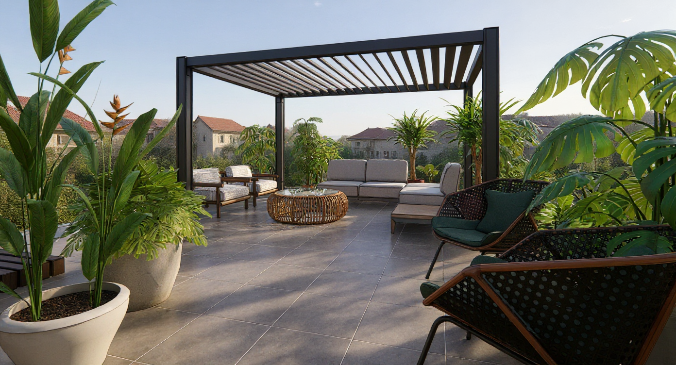 third level terrace render keep existing furniture and layout enhance textures of table chairs flooring and surroundings for a realistic high quality appearance add garden themed decor on the table small plants flowers modern planter include modern neighboring houses of maximum 2 levels only in the distant background considering that this terrace is two levels above them and separated by a wide street without pitched roofs ensure the railing glass is clear and transparent realistic materials lighting and shadows lifelike scene