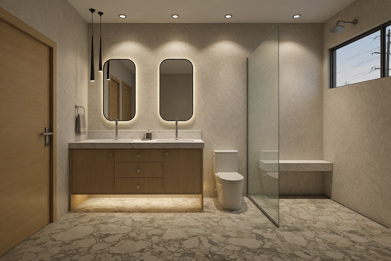 make lighting slightly darker add lighting under vanity keep lighting neutral