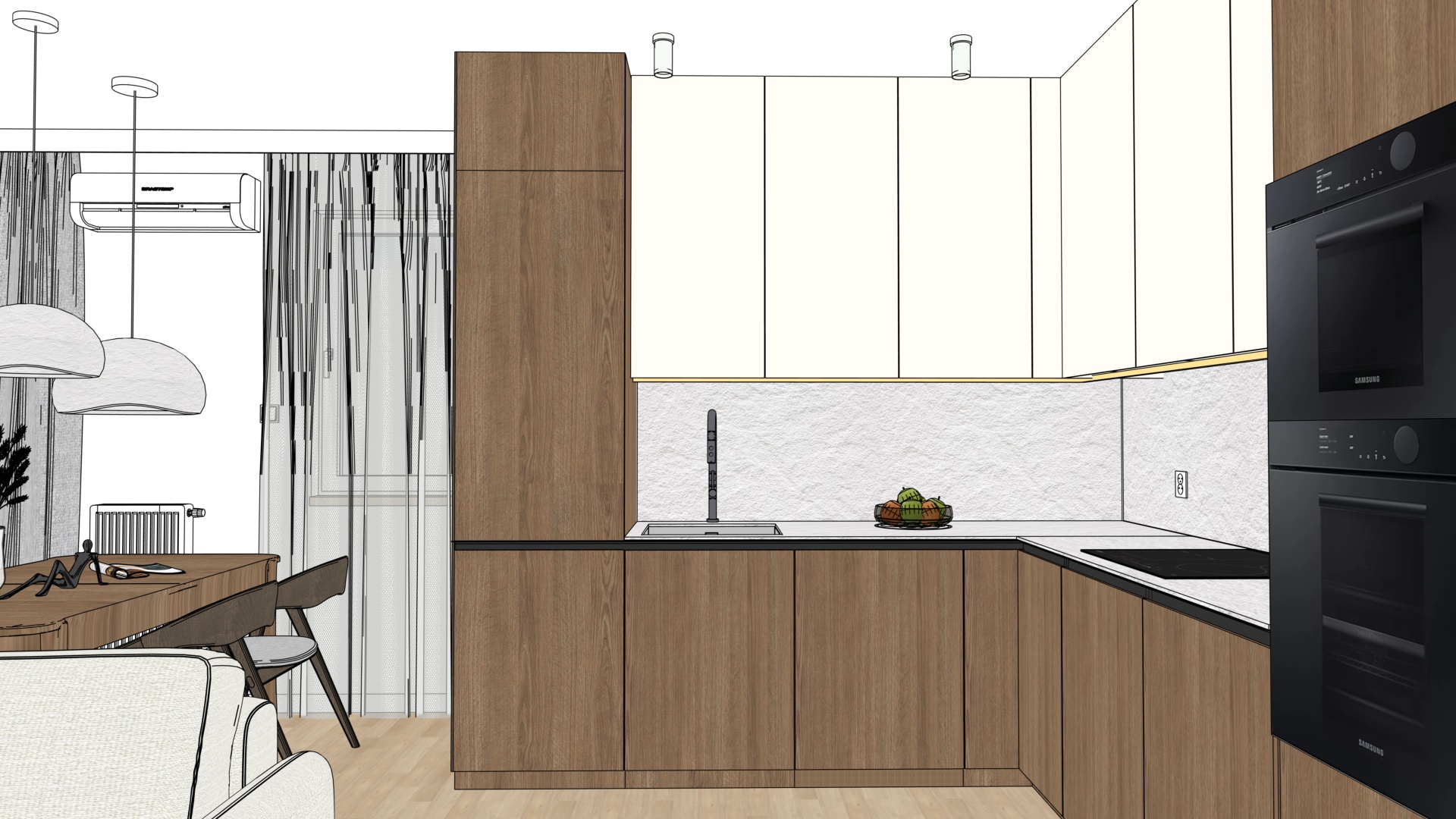 light your interior like a cloudy day transform your interior design photo into a hyper realistic architectural visualization of a contemporary modern interior preserve the exact geometry layout proportions and materials of the original design lighting create an atmosphere of soft overcast daylight reminiscent of a cloudy rainy day without visible rain with diffused natural light streaming through the windows a subtle ambient glow enhances depth and spatial layering maintain balanced contrast avoiding harsh shadows and highlights materials and textures enhance material realism micro details surface imperfections soft reflections precise roughness and physically accurate light response highlight textures wood grain fabric weave stone lamp metal and matte finishes high micro contrast and tangible depth rendering style ultra photorealistic architectural visualization cinematic quality natural color grading neutral tones soft highlights realistic global illumination physically based rendering high dynamic range premium interior photography camera and composition wide angle architectural lens natural perspective eye level view deep focus sharp details throughout the frame natural framing no distortion atmosphere calm elegant contemporary upscale residential atmosphere clean minimalist sophisticated and free of visual noise output 8k resolution ultra detailed noise free sharp edges professional quality architectural rendering negative cons no raindrops glare fog haze motion blur cartoonishness stylization over sharpening artificial glow unrealistic reflections distortion or clutter additional information there is a white radiator under the air conditioning the sofa has no fabric frame on the left side between the curtains there is a white window with a window sill and a curtain above the table there are white rough lamps with a lamb s eye structure do not turn on the lights in the lamps dodaj oswietlenie led pod szafkami kuchennymi nie ma okna nad kaloryferem
