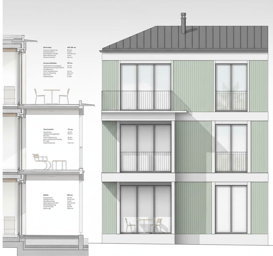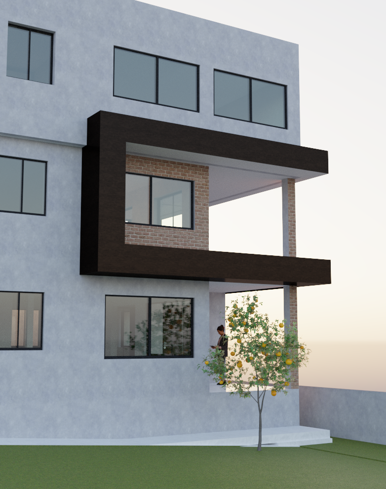 modern architectural building facade three story minimalist polished concrete building with large rectangular windows and a dark frame volume around the second floor balcony same facade and materials as reference image preserve an existing orange tree in front of the entrance located about 2 meter away from the wall the tree must remain untouched and become the focal landscaping element redesign only the exterior stairs to access the entrance while protecting the tree roots and trunk clean modern concrete stairs integrated planter around the tree minimalist white railings contemporary residential architecture soft evening light realistic architectural visualization high quality render landscape integrated with architecture