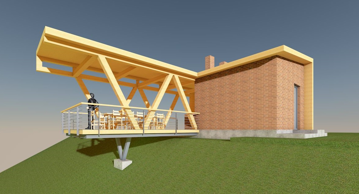 convert the image into a realistic outdoor photograph with professional architectural aesthetic maintaining 100 of the geometry and layout applying authentic materials afternoon warm lighting with soft shadows and a sharp photorealistic result add landscape design behind the building do not change material colors