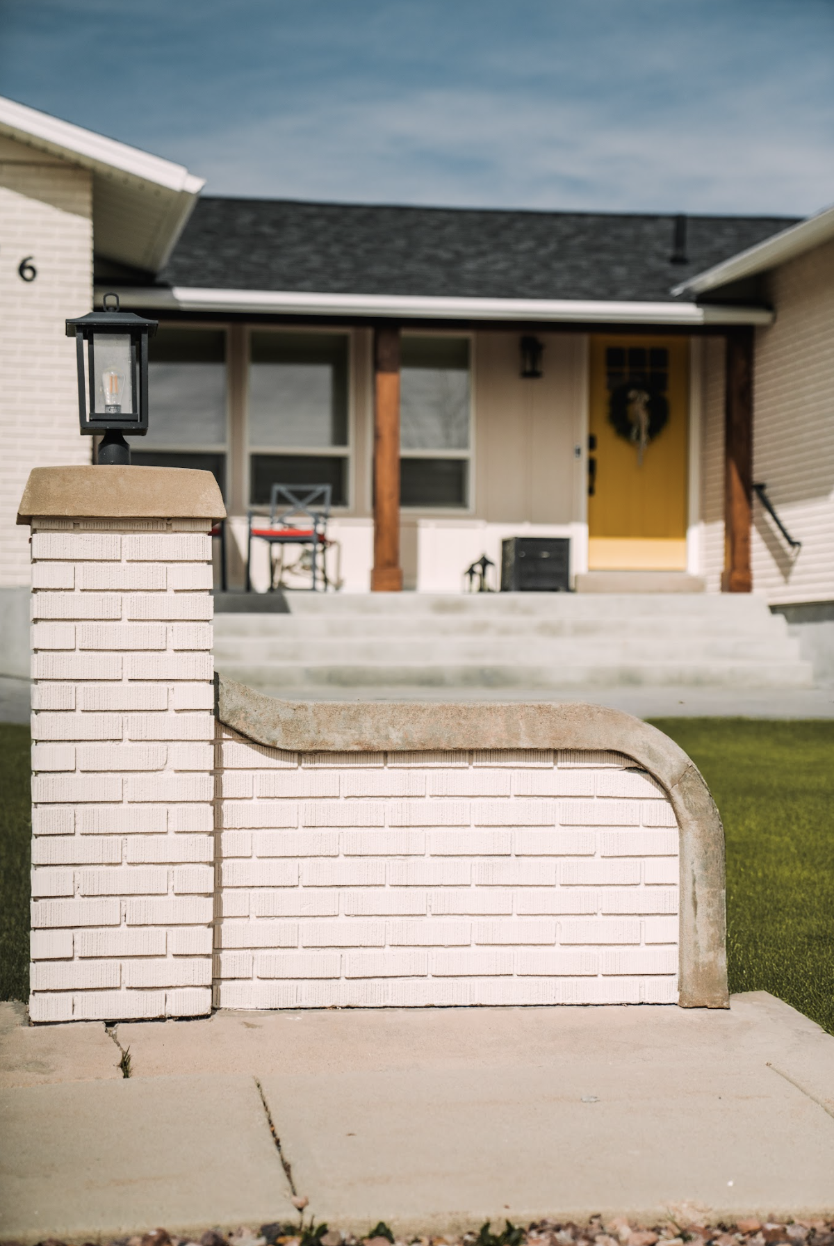 add a box wood plant to the black planter box on the porch