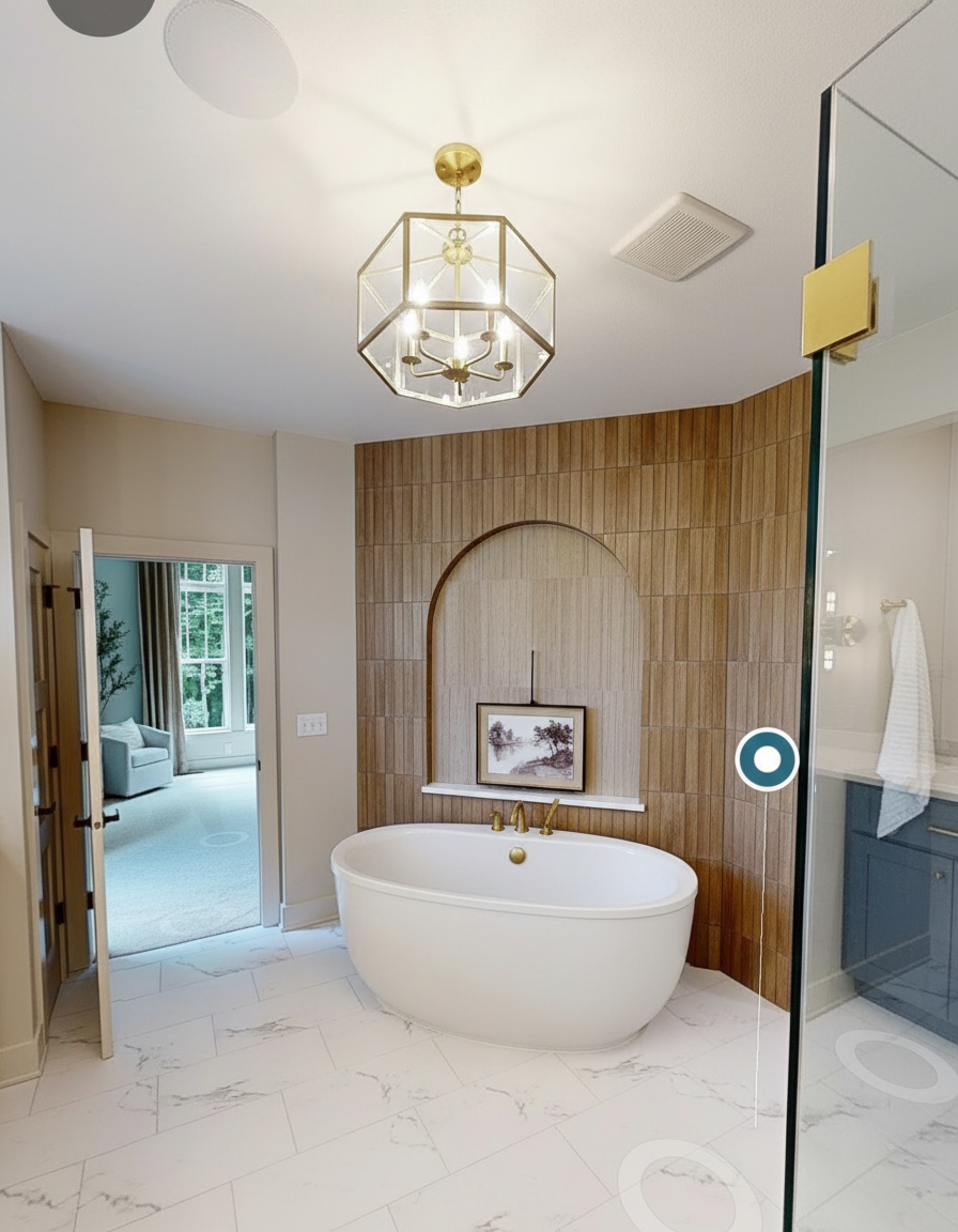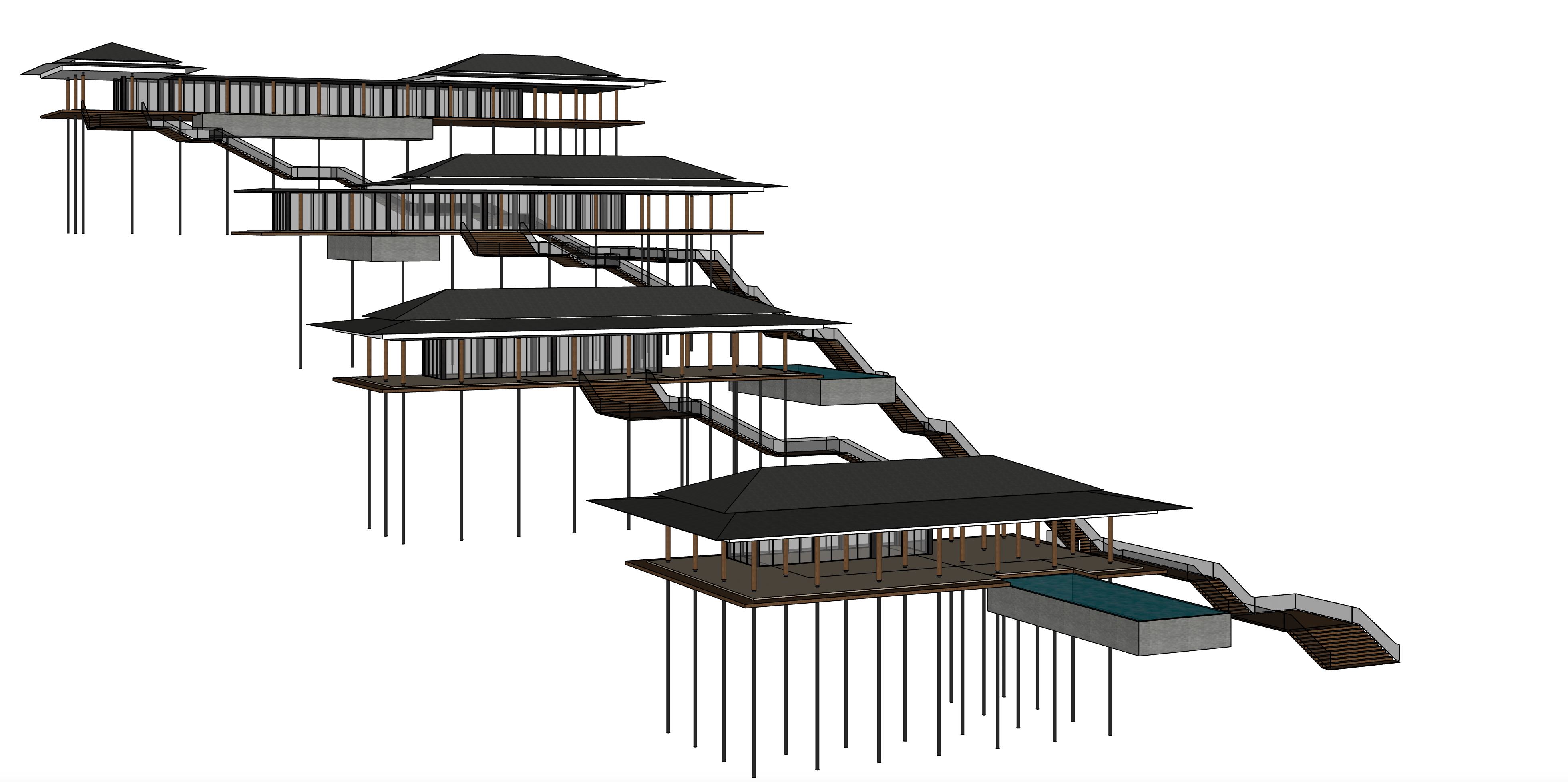 exterior shot render the existing 3d drawing from a new eye level angle facing toward the sea do not change add or remove any elements from the original 3d model enhance the luxury japanese style villa with its wood columns dark roof and minimalist modern design emphasize the stilt construction that makes the building appear to float above the coastal hillside dry forest maintain the ambience sea in the far background small road and pedestrian path in the lower foreground and dense tropical vegetation covering the upper hill behind the villa