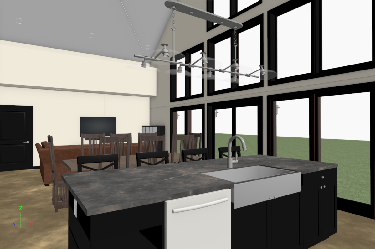 a cinematic ultra realistic interior rendering of a modern farmhouse kitchen and living space bathed in natural sunlight retain all design details black framed floor to ceiling windows dark cabinetry farmhouse sink stone textured island countertop wooden dining table and chairs and a cozy sofa near the tv capture warm golden sunlight streaming through the large windows filtered through the branches of nearby trees creating a soft dappled glow on the floor and furniture outside the windows show a lush green tree filled backdrop that evokes tranquility and connection to nature add subtle reflections warm interior tones and lifelike textures for cabinetry fabric and wood grain the overall atmosphere should feel inviting elegant and aspirational perfect for marketing brochures website hero banners or lifestyle showcase imagery