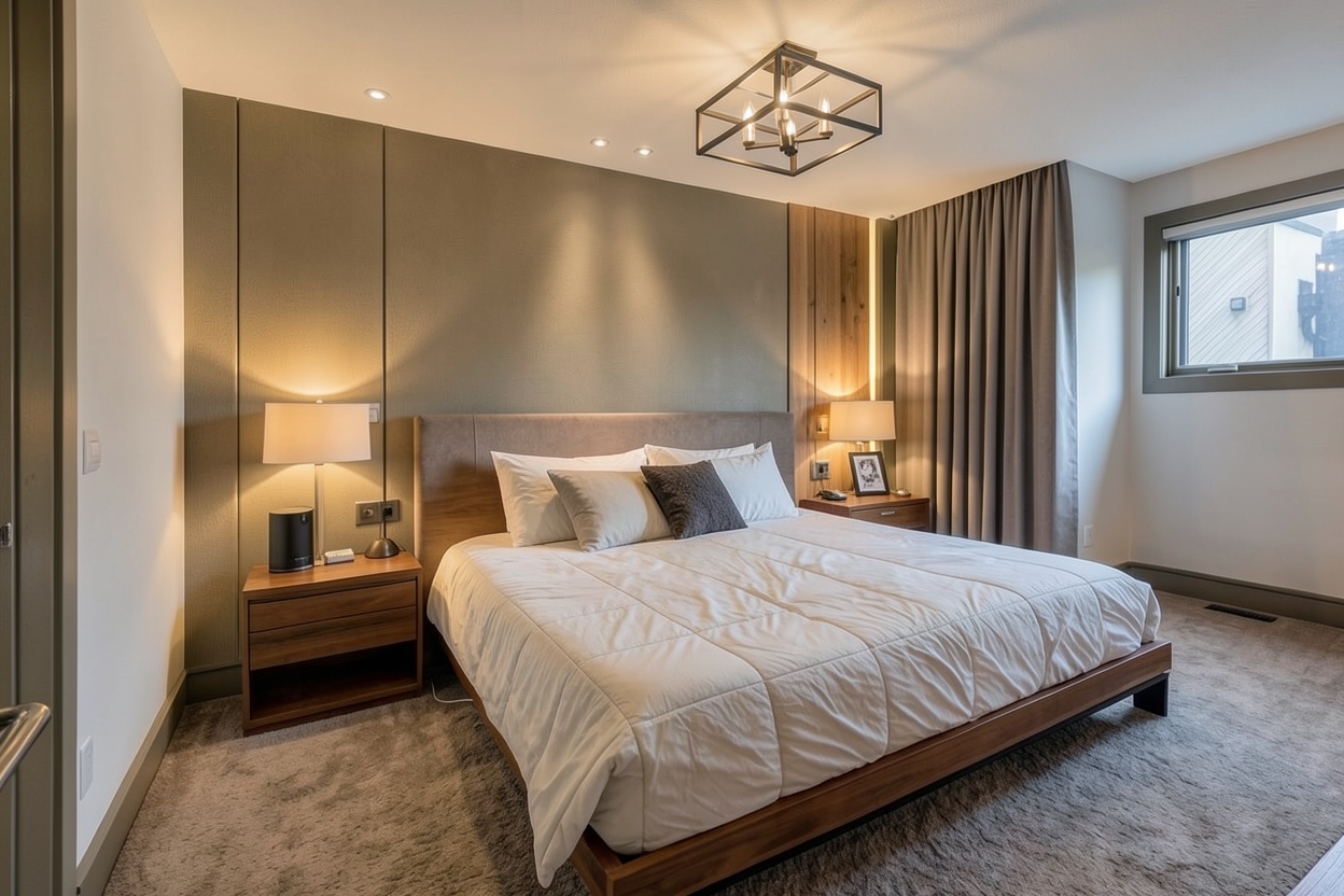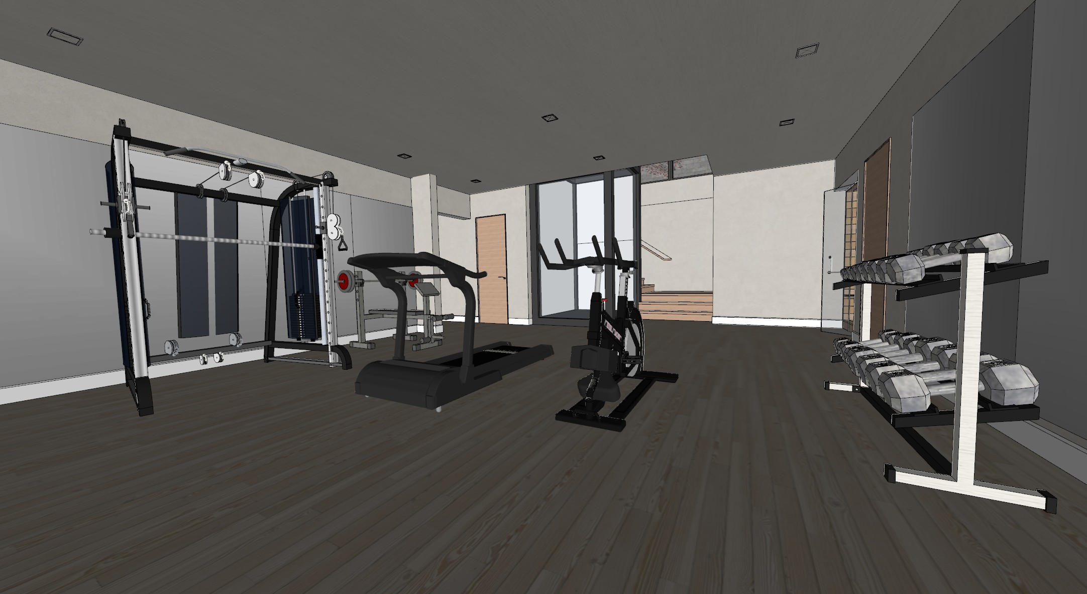 make home gym look realistic wood floor to be lighter grey material on left and right wall are mirrors glass box at the rear is a glass elevator dont add glass box in front of stairs