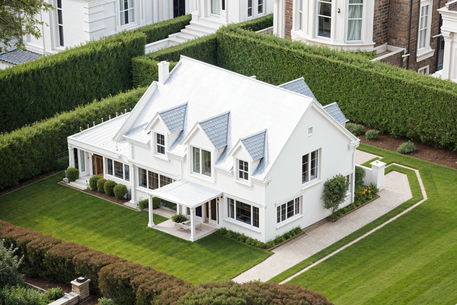 colonial revival exterior shot white on white white timber windows and doors with small brass accents make sure its exactly how our plan is layed out not improvised on the decking can be a warm oak colourd decking all external lighting can be in vintage brass look with a warm glow down for effect building in the rear can have a timber barn door etc architecture