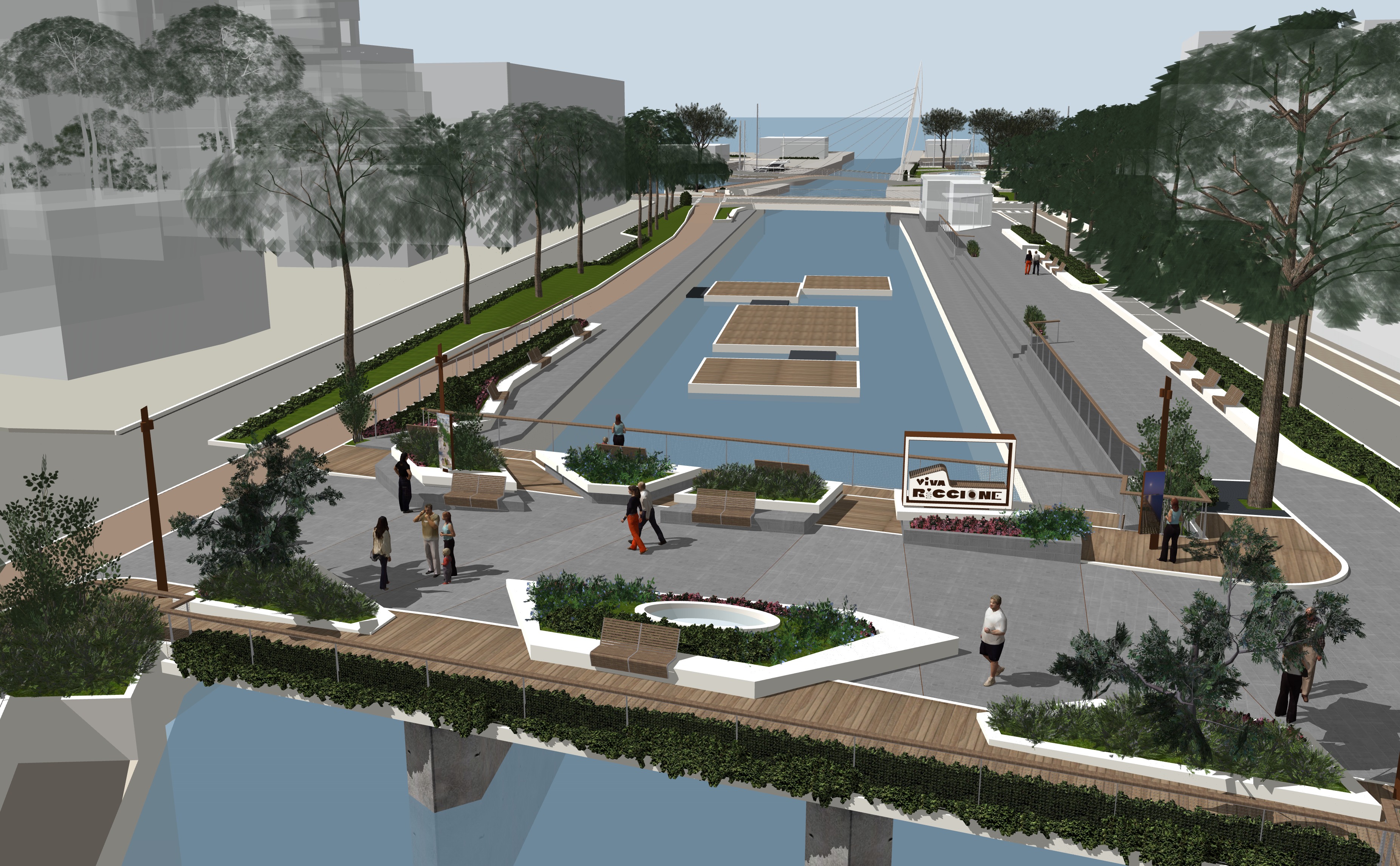 new street furniture on the river it s a warm summer night a band is playing on four floating platforms and numerous acrobats and jugglers are putting on a show many people are watching the show from both banks sitting on the steps and from the bridge enjoying themselves immensely the entire area is illuminated with atmospheric lighting keep the surrounding buildings abstract without adding windows doors decorations or other details