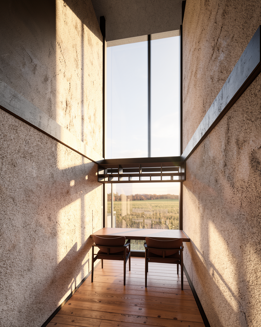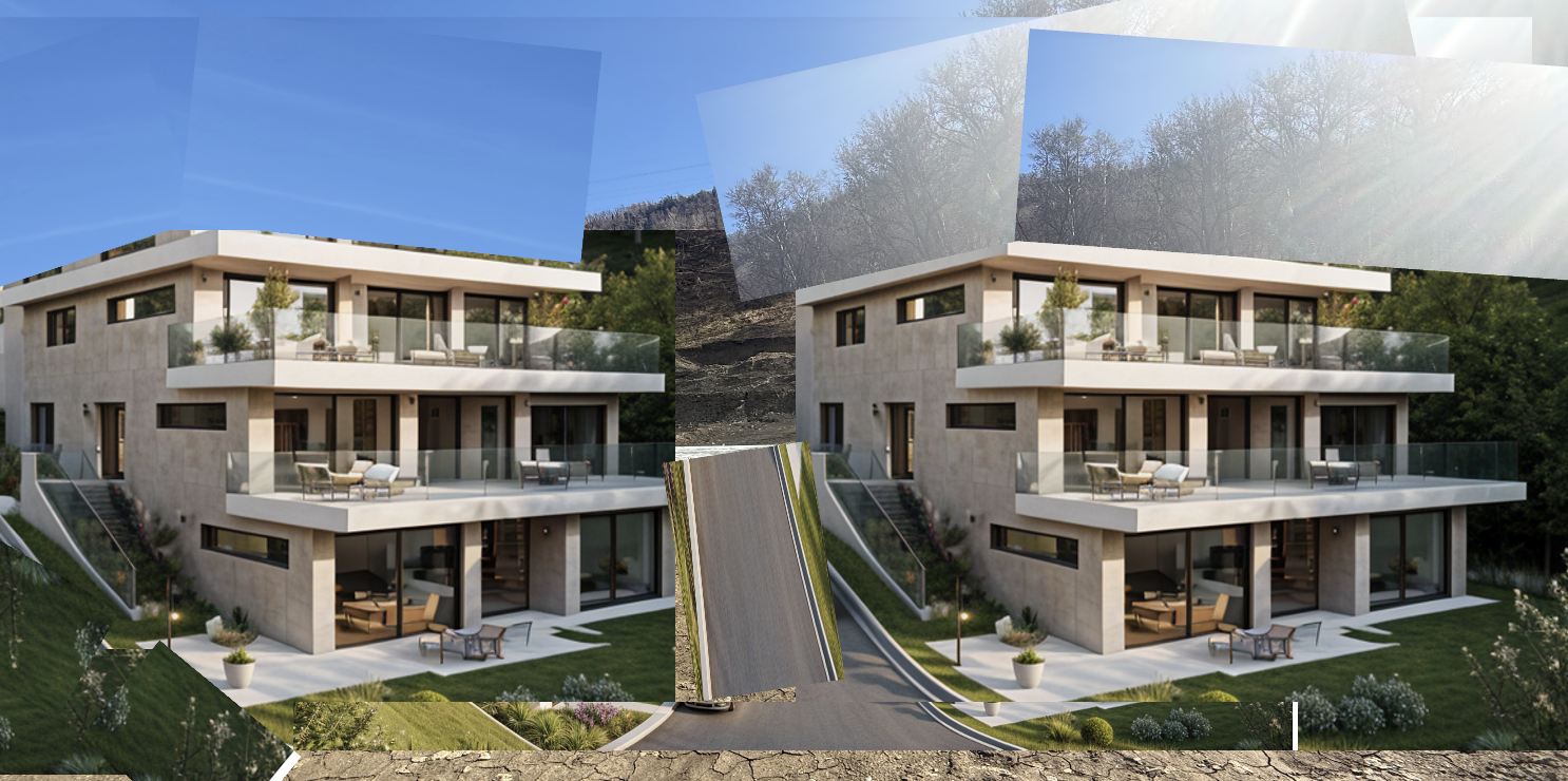 photorealistic architectural rendering of two identical contemporary apartment buildings placed side by side separated by a 6 meter private access road leading to rear parking areas on both sides each building measures 15 meters wide by 22 meters deep with 3 levels in total including the ground floor floor to floor height is 2 80 meters very important each upper floor is recessed by 2 meters compared to the level below creating large stepped terrace balconies on every level the first floor is set back 2 meters from the ground floor and the second floor is set back another 2 meters from the first floor architecture style premium swiss contemporary residential design minimalist elegant and realistic use warm beige mineral facades light exposed concrete horizontal bands floor to ceiling windows slim dark window frames glass railings and flat roofs the terrain is mostly flat with a slight uphill natural slope behind the buildings allowing part of the lower ground floor to be subtly integrated into the land at the rear include a dense forest with mature trees add clean landscaping subtle planting and a few modern cars to show scale and access use soft natural daylight a bright sky realistic shadows and a polished high end real estate marketing atmosphere preserve the exact massing spacing facade setbacks and overall layout each building must measure approximately 15 meters wide by 22 meters deep the terrain is mostly flat with a slight uphill natural slope behind and above the buildings allowing part of the lower ground floor to be subtly integrated into the natural terrain the slope should remain soft realistic and elegant each floor height is 2 80 meters 3 in total at every level the facade line at the glazed openings is recessed by 2 meters 1st floor compare to ground floor ans an other 2 meters for second floor compare to 1st floor to create large continuous balcony terraces emphasize these recessed terraces with generous outdoor depth realistic shadow lines and a premium residential feel architecture style modern clean elegant investment grade swiss contemporary residential design use warm beige mineral facades light exposed concrete horizontal slab bands large floor to ceiling windows dark slim window frames and glass balcony railings the buildings should feel refined balanced and realistic similar to a high end real estate development rendering show both buildings clearly in the same perspective the central 6 meter road must be visible and functional with realistic vehicle access leading toward the back add a few contemporary cars in a subtle way to explain circulation and parking access at the rear include a dense forest edge with mature trees add clean landscaping subtle grass areas restrained planting and a calm natural environment the setting should feel residential quiet green and premium lighting soft natural daylight slightly warm with realistic shadows and a bright sky with light clouds keep the composition architectural clean photorealistic and suitable for a luxury real estate promotion package important preserve the overall massing spacing proportions balcony recesses and the central road layout do not add extra buildings do not change the contemporary flat roof design do not make the terrain too steep no chalet style no pitched roofs no overly steep terrain no urban towers no curved buildings no dramatic futuristic forms no excessive vegetation hiding the architecture no distorted proportions no clutter no dark scene no low quality textures