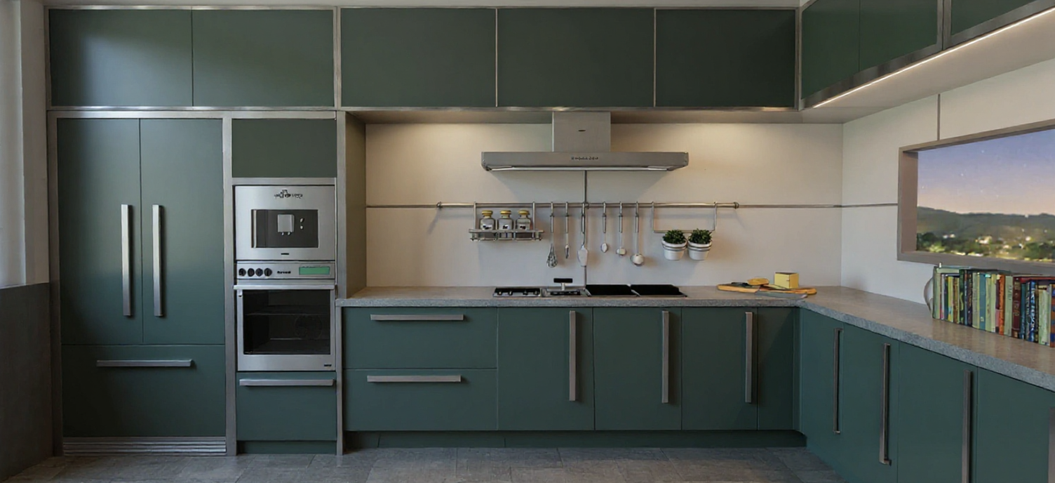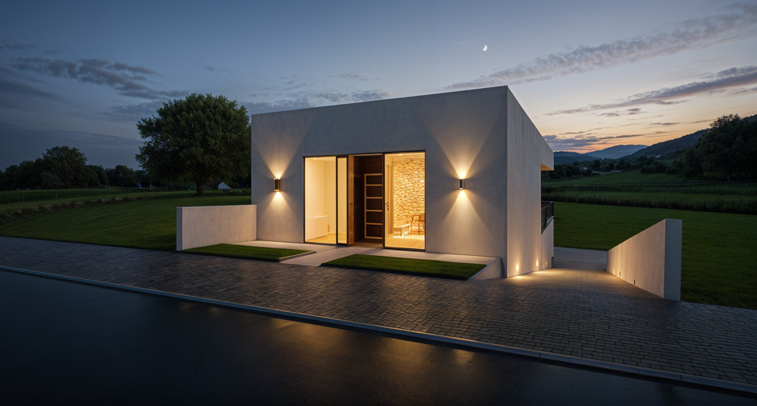 add hanging lighting on the left side of the building over the desk and a pink senic painting on the wall that is on the right
