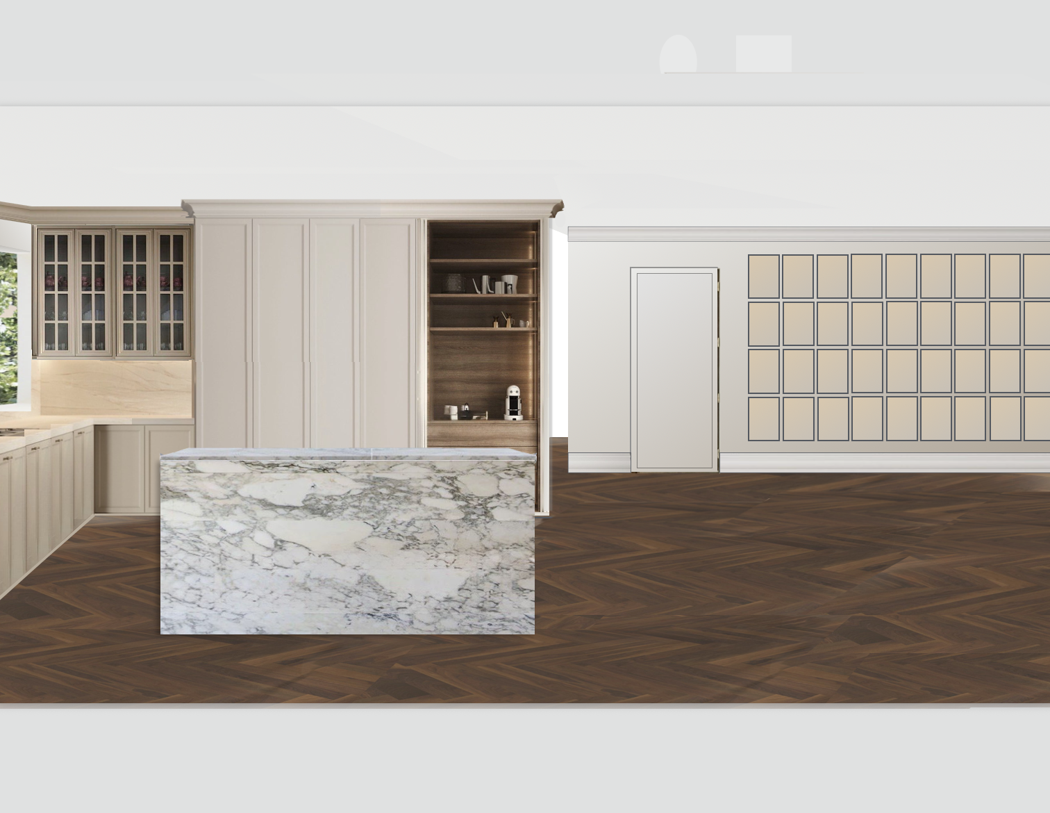 interior shot white space right of open cabinet is a door leading to room behind pantry cabinets photo wall lines up with corner to this rooms door
