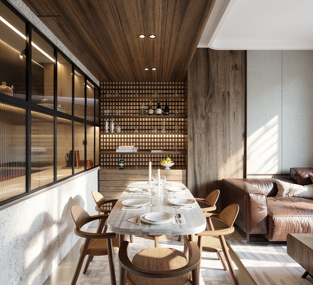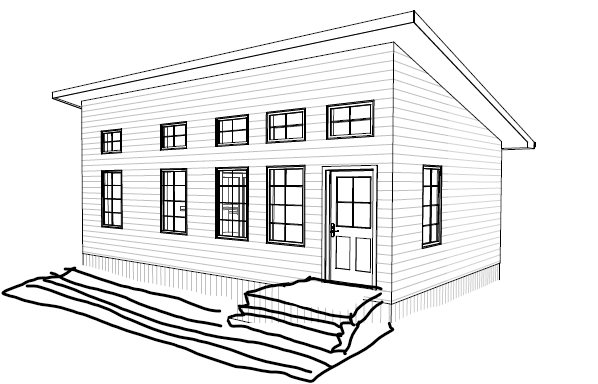 light tan siding steps with railing from door down to a lower wooden deck on grade with no railing forest type setting