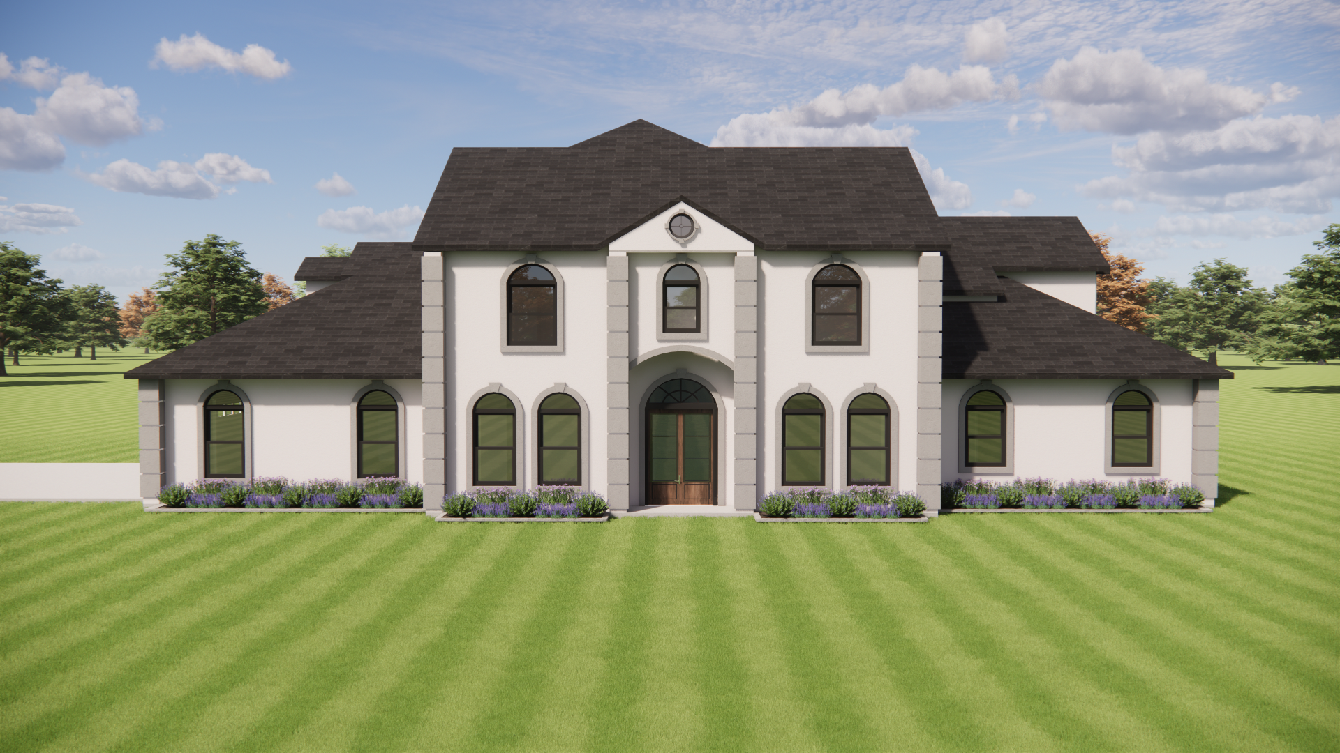 you are a professional image renderer you create the highest grade renderings around and specialize in architectural renderings this is the front elevation of a house create a high resolution photorealistic image of this structure keep the windows as they are where they are keep the doors as they are where they are keep the main structure as it is where it is feel free to change the perspective keep the roofline as it is where is it do not add anything to the structure that i have not asked for the roof is composition shingles architectural style this is a light colored stucco with cast stone keystones the front door will be wood the background will be a wooded background similar to texas it should be early afternoon with a bright sunny day clear skies the landscaping should be late spring with plenty of color and should be that of a luxury estate