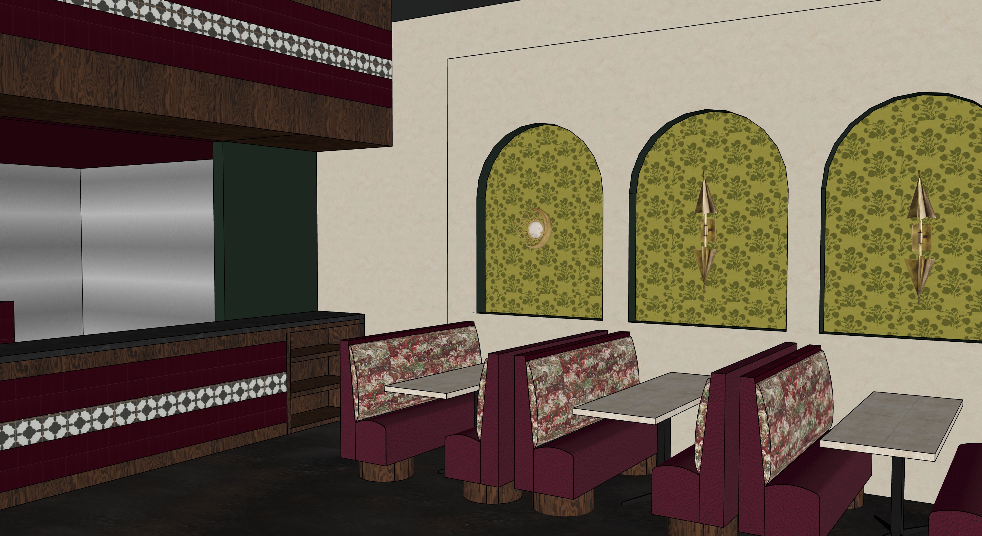 ultra photorealistic professional interior photography of a high end spanish inspired restaurant banquette seating area creamy stucco textured plaster walls with recessed arched alcoves containing vintage yellow green floral wallpaper warm brass wall sconces centered in each arch alternating between sculptural elongated cone sconces and frosted globe sconces emitting soft warm 2700k ambient light with realistic glow and falloff custom upholstered banquette seating in rich burgundy textured leather with subtle weave detail backrests feature inset patterned upholstery panels with realistic fabric depth and stitching banquette base constructed of dark stained oak wood plinth with visible wood grain texture and matte satin finish tables are solid honed travertine stone tops with natural pores tonal variation and slightly eased edges supported by matte black steel pedestal bases with subtle wear and soft reflections floor is dark polished concrete with realistic micro texture subtle reflectivity and natural imperfections lighting is cinematic and layered soft indirect ambient lighting warm accent lighting from sconces subtle bounce light and gentle shadow gradients physically accurate global illumination ray traced reflections ambient occlusion and contact shadows camera perspective is straight on eye level interior architectural photography 35mm lens perfectly symmetrical composition shallow depth of field but overall sharp focus professional hospitality photography editorial quality ultra high resolution extremely detailed textures realistic materials natural imperfections filmic color grading style references high end hospitality interior photography boutique luxury restaurant architectural digest professional commercial interior shoot render settings photorealistic ray tracing global illumination physically accurate lighting ultra detailed 8k resolution cinematic lighting sharp focus realistic materials no stylization no illustration no cgi look