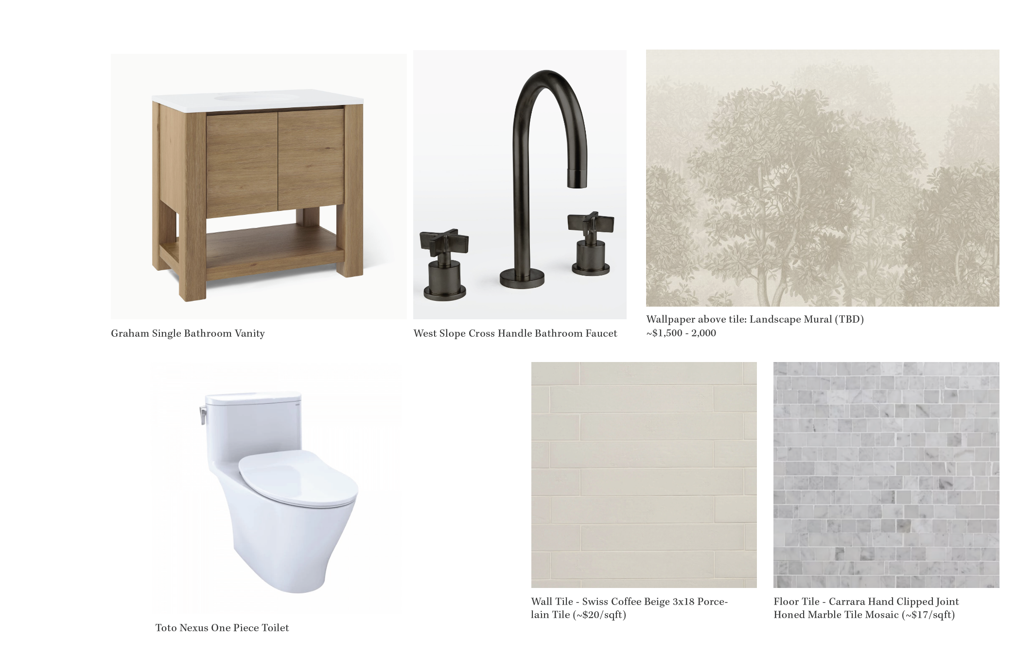 small powder room with no windows and the toilet and vanity on the same wall the walls are 3x18 off white tile tile at 42 tall and mural landscape wallpaper above to ceiling the flooring is a carrara hand clipped joint marble the fixtures and lighting are all an bronze finish wabi sabi vibe