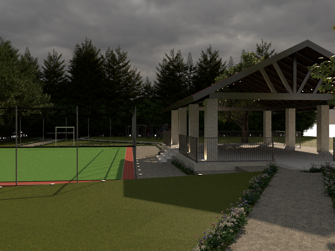palapa moderna y elegante totalmente exterior con estructura de acero color gris minimalista de l neas limpias y proporciones esbeltas techo de lambr n color chocolate con acabado fino y continuo y spots de iluminacion en el techo columnas revestidas en cantera clara apariencia sofisticada y contempor nea ambiente anocheciendo piso exterior con zacate natural bien definido y jardiner a perimetral en las orillas de los andadores con su iluminacion con vegetaci n ornamental ordenada y elegante espacio exterior de alto nivel atm sfera sobria moderna y lujosa sombras suaves realismo fotogr fico no iluminacion sobre columnas