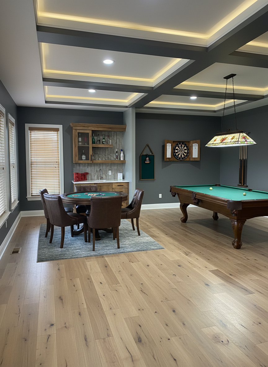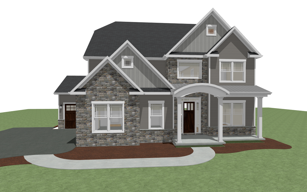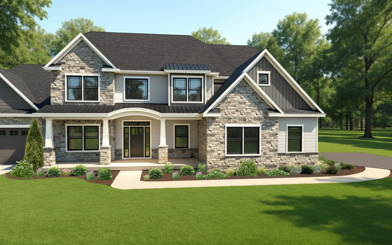 create a photorealistic rendering of a house using the original image all structural features including rooflines windows doors and exterior materials must remain exactly as shown do not modify any architectural elements enhance the image by adding photorealistic front yard landscaping lush green grass flower beds with color variety low shrubs and an inviting path to the door keep lighting natural and the home fully visible add a realistic row of mature trees behind the house to create a tree lined property ensure scale shadow and lighting match the scene trees should complement the setting without covering any portion of the home