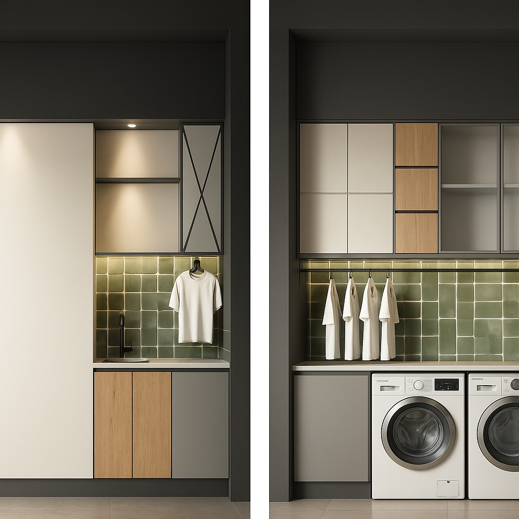walnut uppers coffered ceiling details dark green base cabinets off white trim