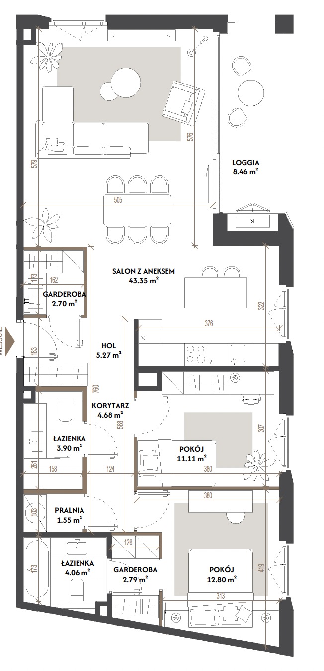 convert this floor plan into a realistic isometric 3d view of a full house show the space from an elevated angle with furniture walls and details visible in the kitchen make an island one bathroom with bath tub and one bathroom with shower use the same furniture as shows on the plan do not change the orientation of the floorplan