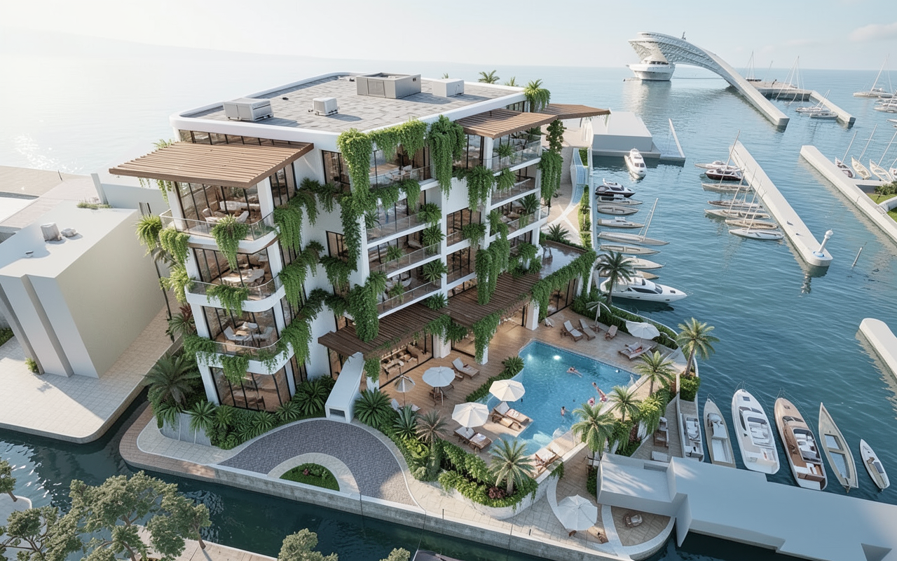 a new 5 star hotel on the dock it uses an architectural language reminiscent of luxury yachting with the dominant color being white all floors feature deep loggias and numerous overhanging balconies especially on the upper floors with wooden slatted ceilings lots of hanging greenery fully glazed walls lush greenery on all floors on the middle terrace there s a swimming pool with plenty of loungers cruise ship deck style a few umbrellas and sunbathers the uppermost roof terrace is not accessible it features only paving and a few technical spaces