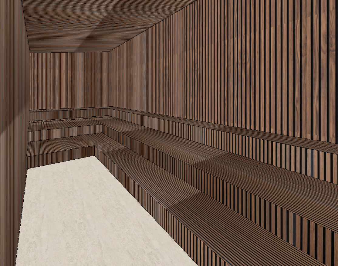 wood a little lighter led strip lights under the seat benches all 3 add indirect lighting in corners of ceiling