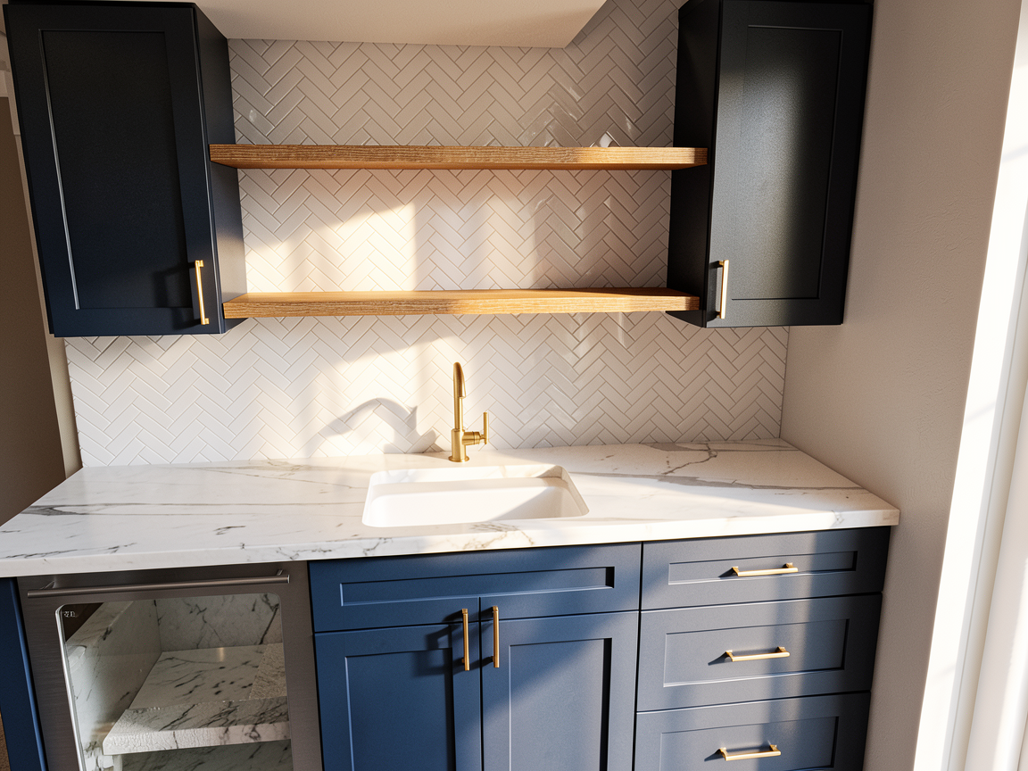 render a modern kitchen interior featuring warm wooden cabinets and a sleek black pendant light highlight the creamy countertops and cabinets for a clean minimalist look the curtain in the kitchen is soft and grey marble texture and the kitchen countertop is wooden like the top cabinets emphasize a cozy atmosphere with soft ambient lighting the dining table should have a natural wood finish with elegant greenery in a clear vase use muted green for the dining chairs for a subtle contrast ensure the flooring is a light oak color enhancing the serene and inviting ambiance
