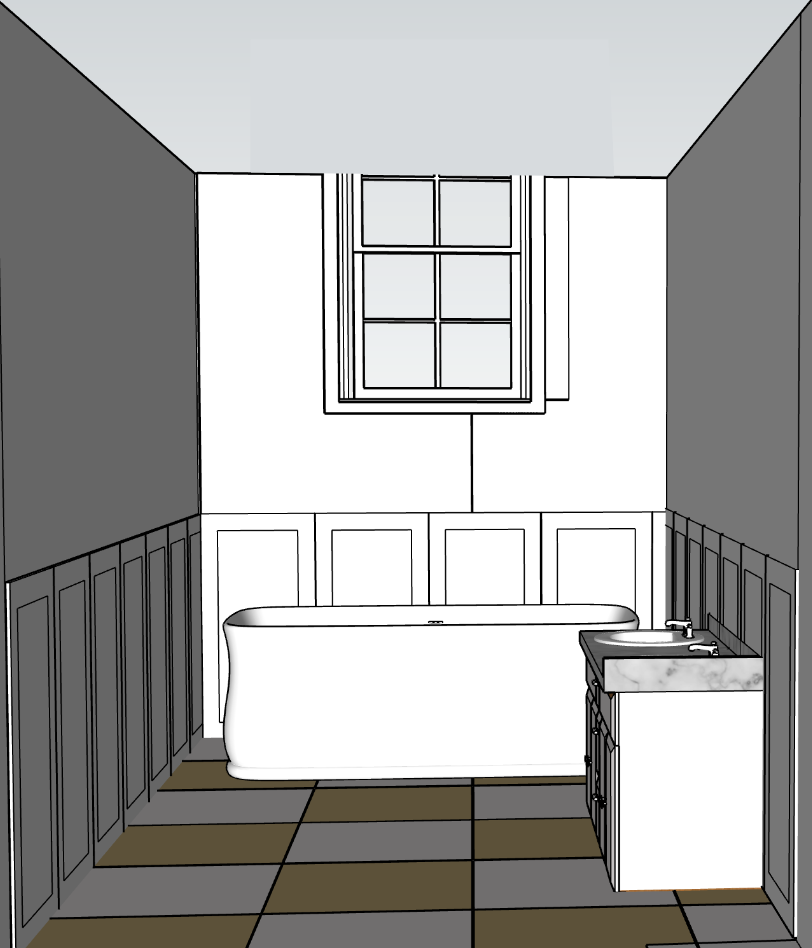 make the flooring lighter the window to have 4 window panes instead of 6 taps to be brushed brass remove bath matts wall colour to be painted off white panelling to be painted in cream flooring to be 60x60cm neutral tile window to have 4 panes of glass not 6 wall colour to be a painted off white