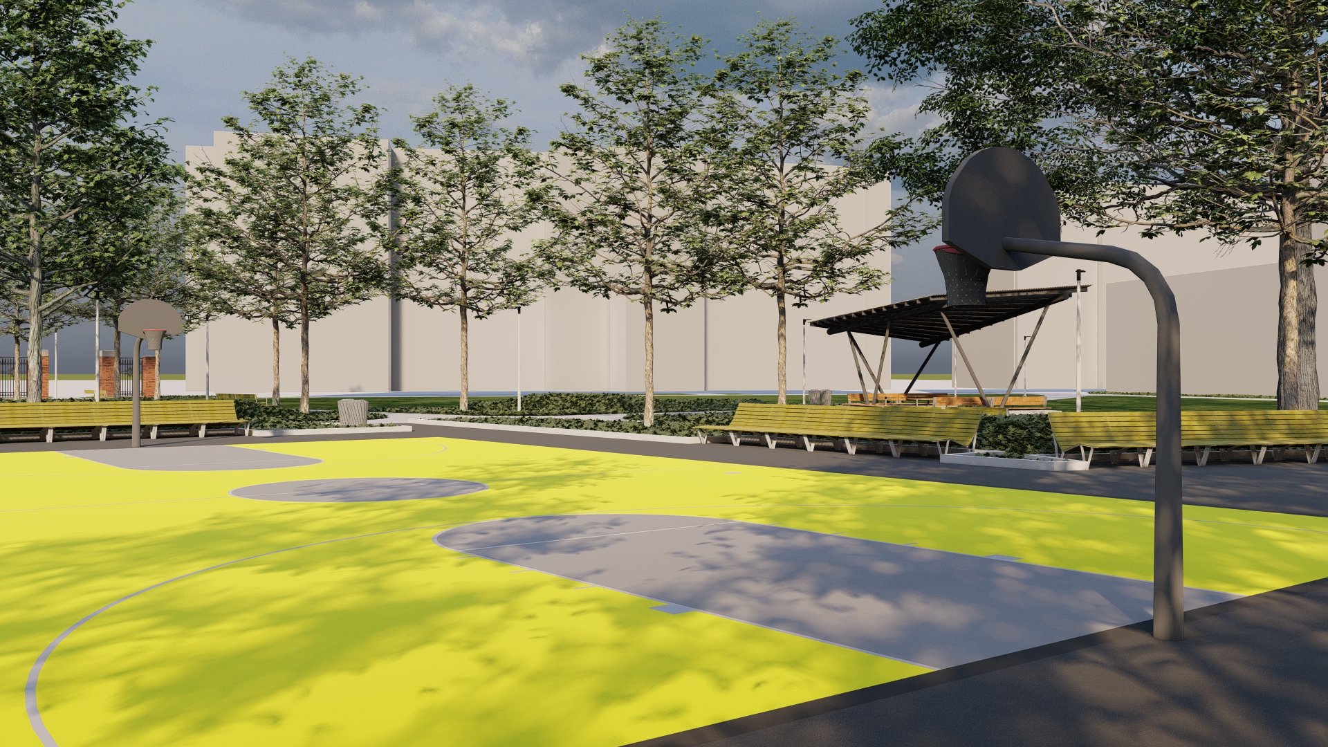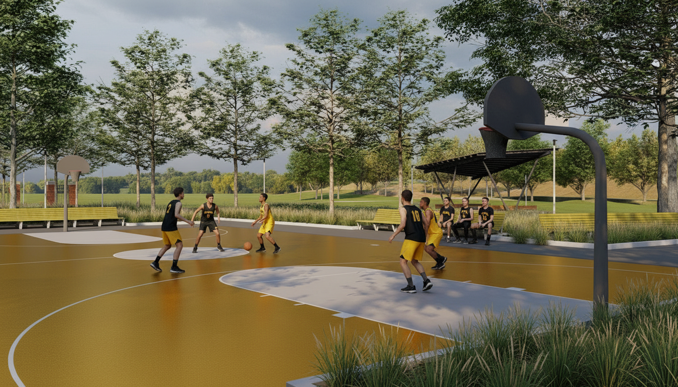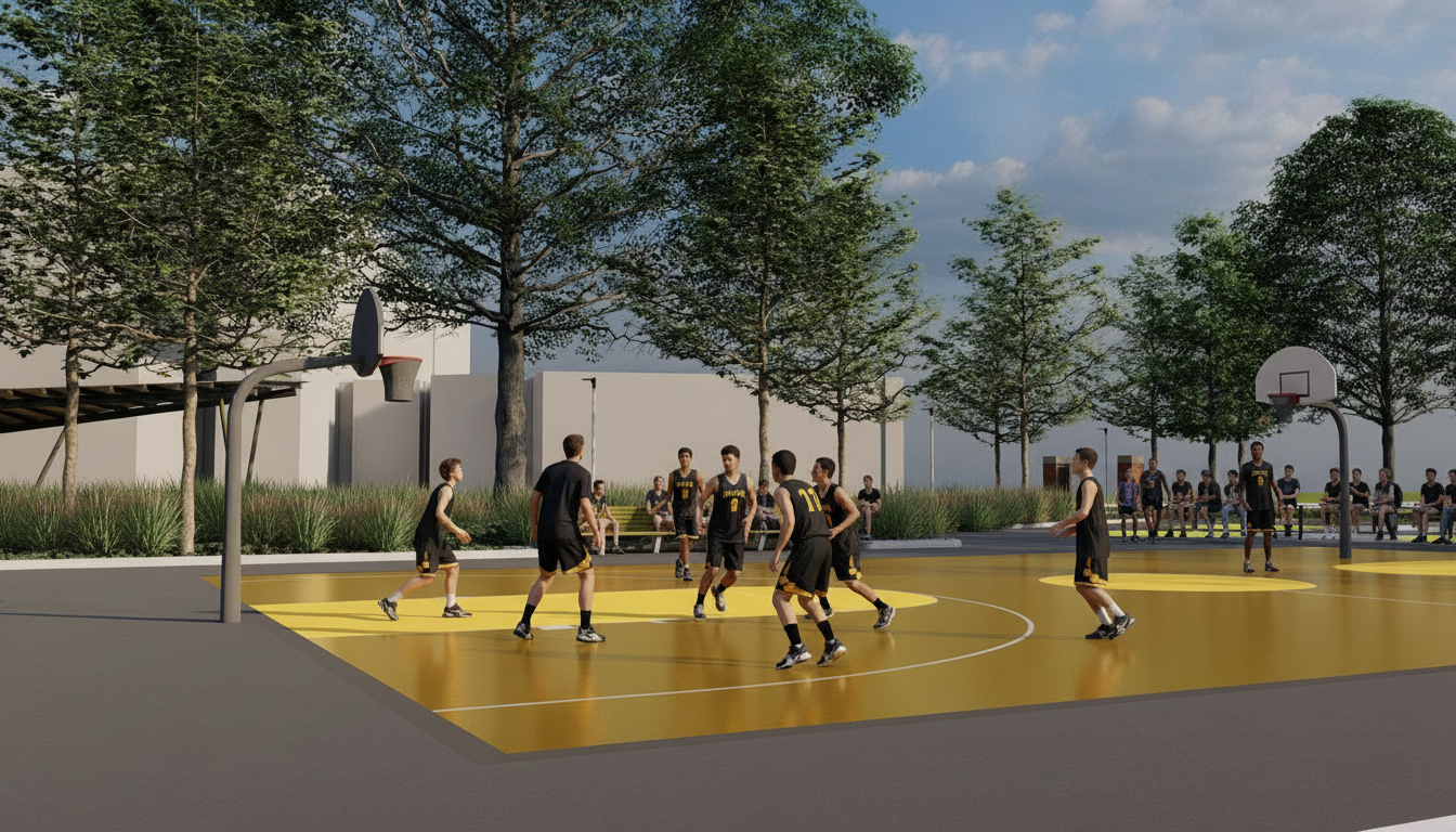 don t change the main content of the image make yellow on court university of iowa gold have students playing basketball wearing black and gold clothes plant beds shall be short native iowa grasses have students watching basketball on wood bench on edge of court leave background as is