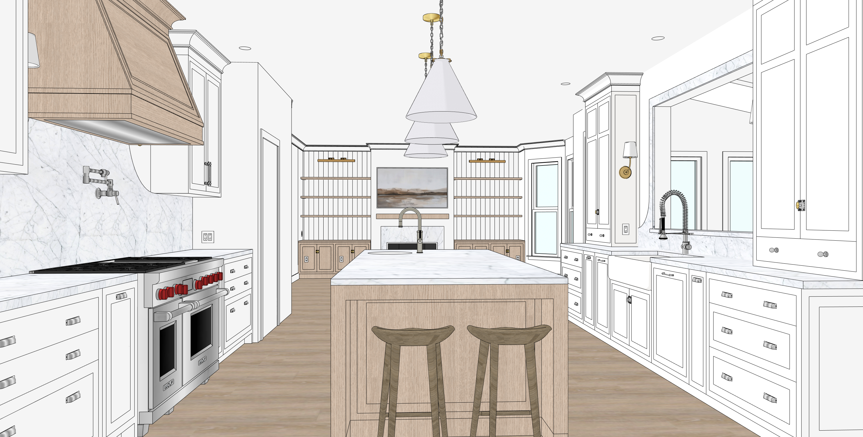 kitchen interior natural day light with white cabinets and light pale white oak island and range hood keep geometry exactly the same