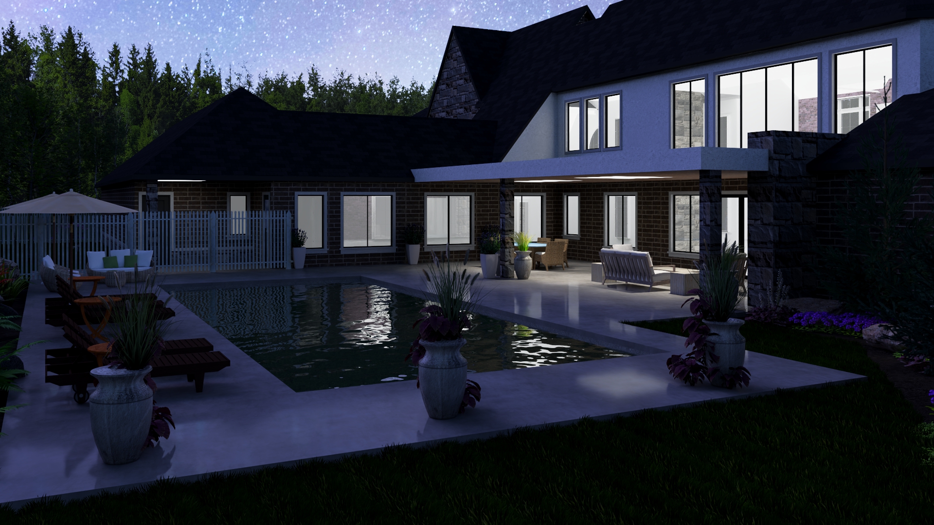 create a majestic nighttime scene featuring a grand stone mansion under a starry sky the mansion s architecture should include brick and stone elements with a slate gray roof bright warm yellow lighting should illuminate the exterior emanating from the large arched windows the driveway should showcase a sleek white luxury car include lush green lawn and landscaping with vibrant purple flowers near the entrance the background sky should be filled with stars highlighting a serene tranquil atmosphere add shadowed silhouettes of trees to frame the scene