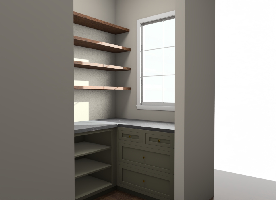 create a hyper realistic image from this pantry rendering cabinets are a muted fern green countertops and backsplash are soapstone wooded view through the windows with sunlight streaming in do not alter the cabinet layout or details reclaimed wood shelves in the pantry add pantry items to shelves