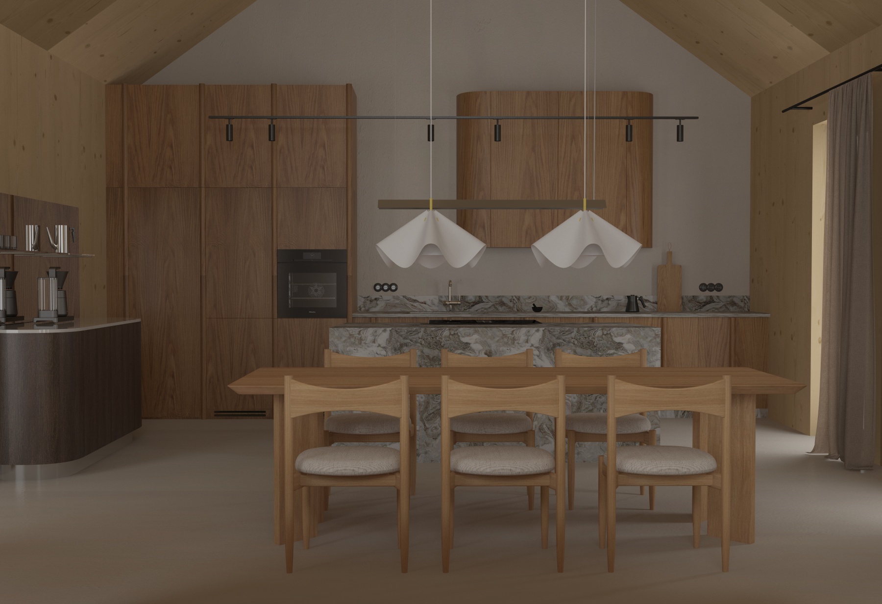 enhance the lighting by adding bright natural daylight streaming through the windows ensure the walls are rendered as flawless select grade clt cross laminated timber wood with virtually no knots or imperfections creating a perfectly clean and smooth wood grain surface while maintaining the original light wood color from the base image maintain high architectural precision and realistic shadows behind the window there is wooden terrace and garden floor is made from beigwe microcement