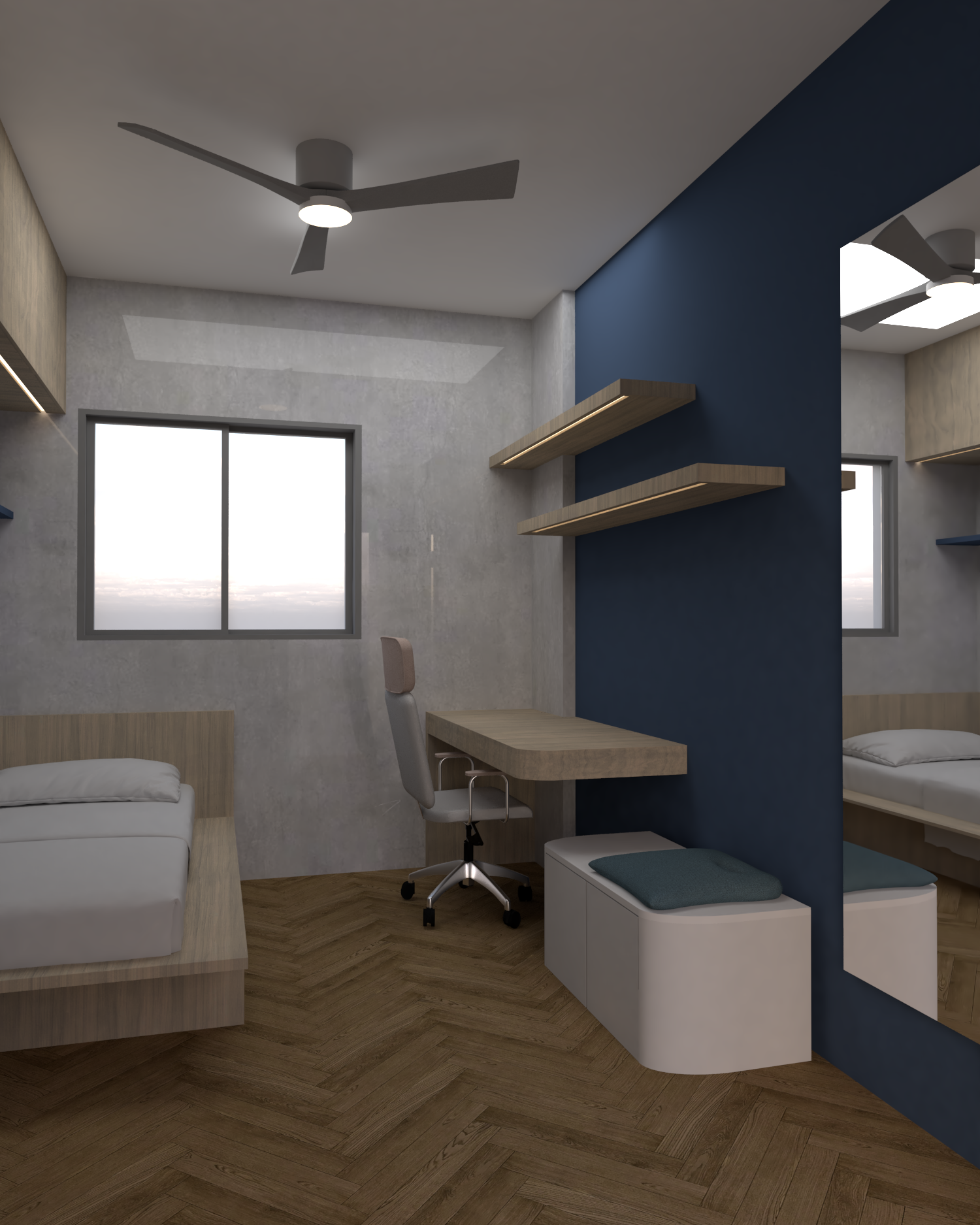 boys room with few toys on the shelves blue pillow on the bed