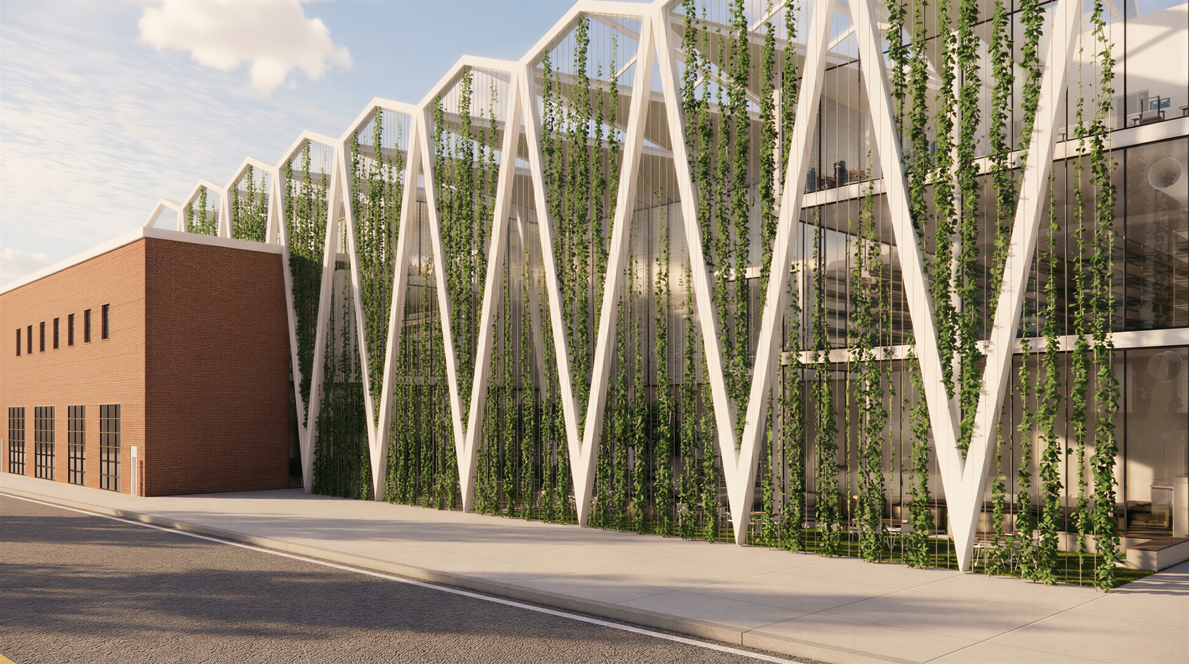 reproduce the scene exactly as shown preserving all architecture vines materials reflections shadows and geometry improve atmospheric realism with a softer natural warm sky no saturation no stylized colors add two acorn street lamps and two benches to the sidewalk no architectural modifications and no changes to the vines