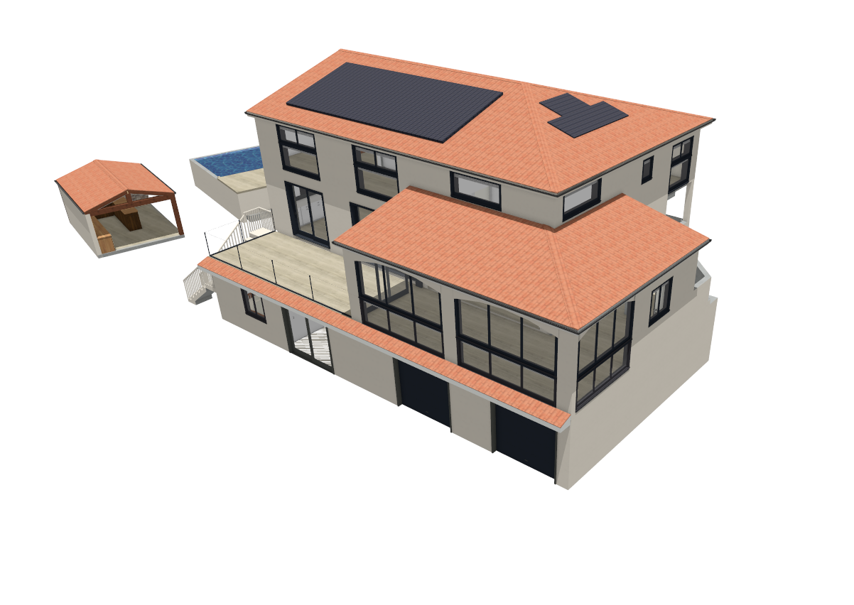 exterior shot a modern house with a warm and welcoming atmosphere the building features a terracotta colored roof and solar panels in sleek dark tones the walls are a soft beige complementing the overall minimalist design large black framed windows add a touch of elegance the wooden patio is a light sandy color leading to a clear blue swimming pool a matching gazebo with a terracotta roof stands nearby the setting is lit by a golden sunset casting gentle shadows and highlighting the residence s architectural beauty