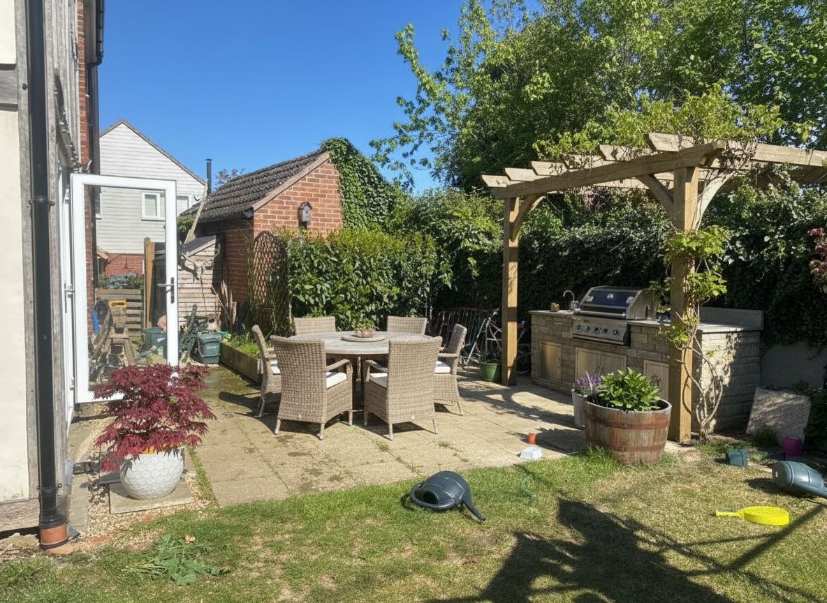create an l shaped pergola that goes along the fence on the right and across the bushes infront of the build building change the paving to natural stone and add a round dining table and bbq area