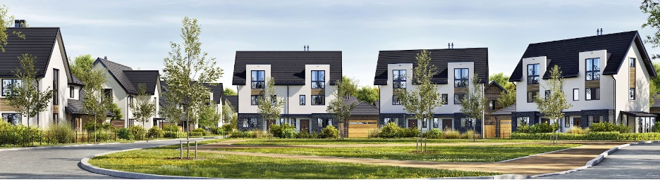 show me this neighborhood in a dramatic evening light change the buildings so they don t look styliticallty exactly thw same but keep them structurally simliar