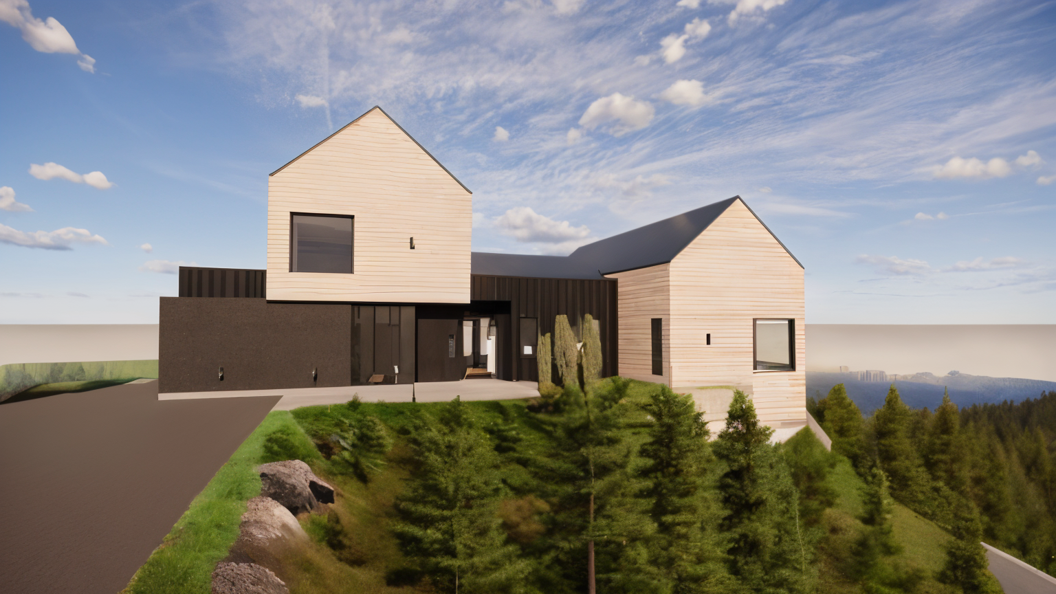 modern nordic home with light wood and stone in facade mountains in the back sunny day modern cars parked one level on top of garage architecture