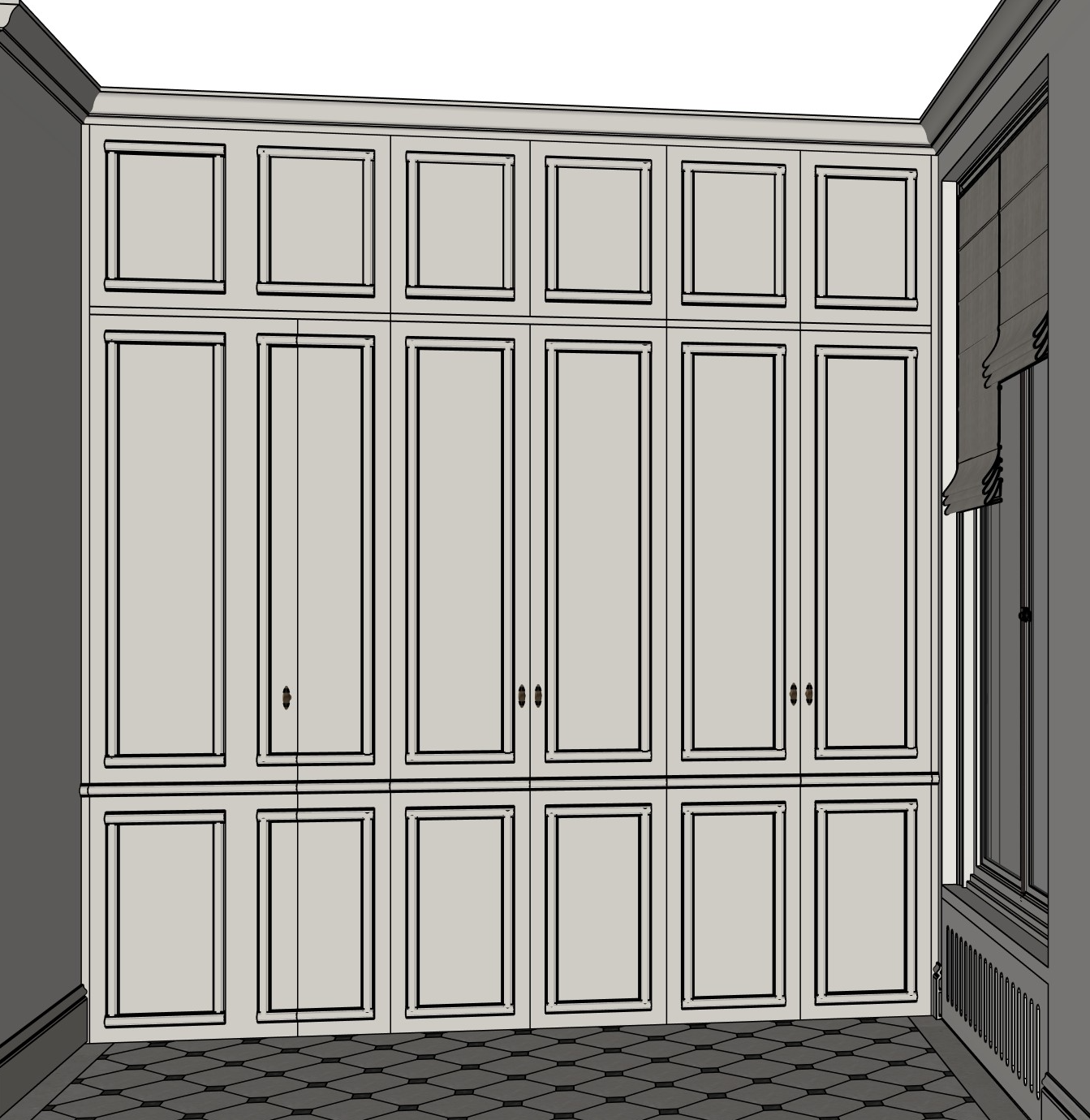 the cabinetry is in light taupe like the farrow and ball purbeck stone https www farrow ball com fr peinture purbeck stone the apartment is located on the 3rd floor of a parisian apartment overlooking a courtyard only the smallest tiles are in black the five door handles are in brushed bronze