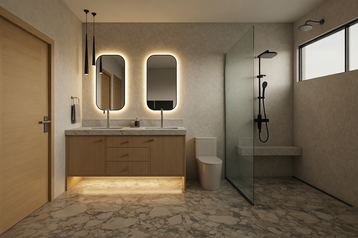 create a hyper photorealistic rendering of this single family house visualization keeping the exact building structure proportions window door positions roof shape visible concrete terrain steps and green contour lines terrain exactly unchanged replace the green terrain areas with lush natural lawn dense mowed grass with realistic texture subtle variations in green tones and soft shadows in accent spots along paths edges and near the house add strategically placed shrubs compact evergreens or flowering varieties and tall ornamental pampas grass with fluffy white plumes swaying gently all perfectly scaled to the house height for balanced composition apply precise exterior materials cover the roof with realistic standing seam metal roofing in dark metallic gray with sharp seams subtle weathering and reflections clad the outer walls in thermo modified wood boards dark brown charred finish horizontal lap siding with natural wood grain knots and slight color variation for authenticity preserve all concrete stairs with raw textured concrete surfaces showing formwork marks use soft natural daylight atmospheric depth realistic sky ground shadows and environmental details for immersive photorealism maintaining original camera angle and composition