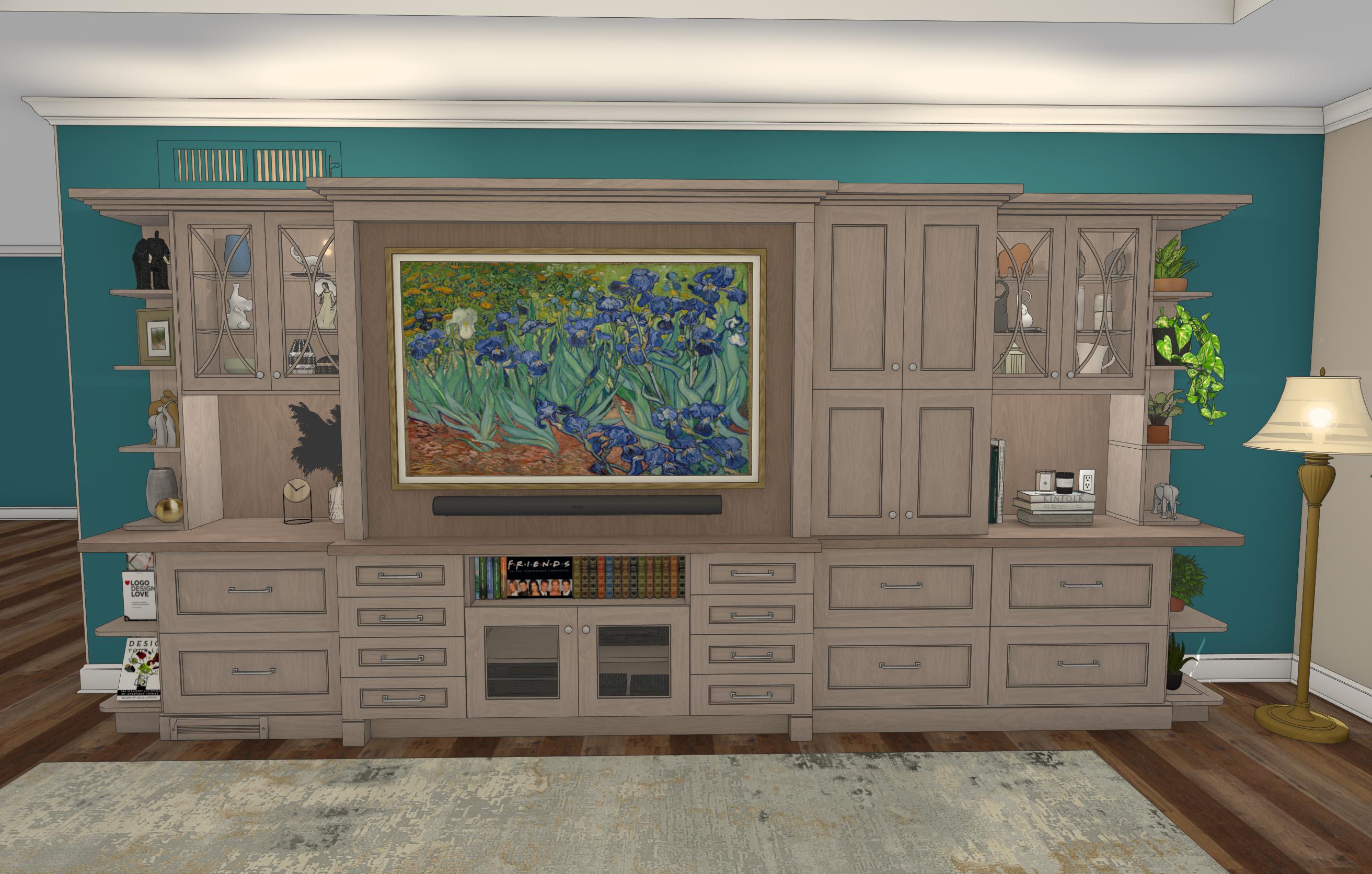 create a cozy and elegant living room scene featuring a large beautifully designed wooden cabinet with detailed paneling the cabinet is in a light oak finish in the center showcase a vibrant painting inspired by van gogh s irises framed in gold the shelves are adorned with tasteful sculptures and books use a rich teal for the back wall to contrast the warm medium brown wooden floor add subtle lighting from a classic brass standing lamp with a soft yellow shade the rug is muted with beige and soft blue tones ensure a balanced serene atmosphere with harmonious colors