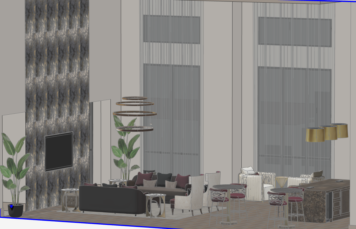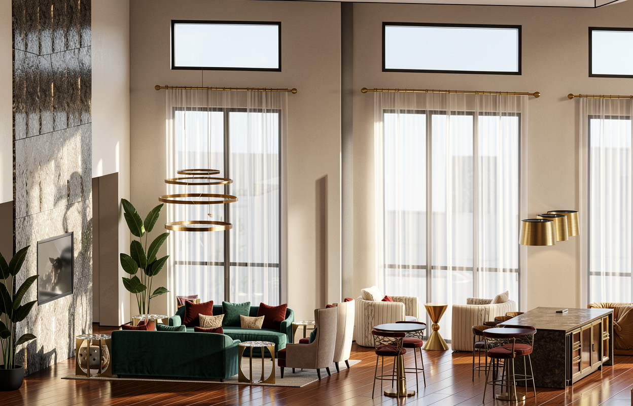 photorealistic luxury hospitality interior refine all materials and textures realistic upholstery warm wood floors polished stone and brushed brass improve natural daylight through tall windows with soft ambient lighting add realistic shadows depth and reflections clean edges no grain modern luxury restoration hardware style high end hotel lounge cinematic 4k architectural render