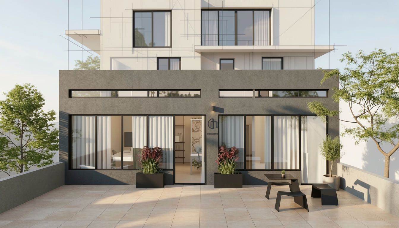 turn this old service station into a parisian style bistro and florist with glass front garage doors and beautiful outdoor seating