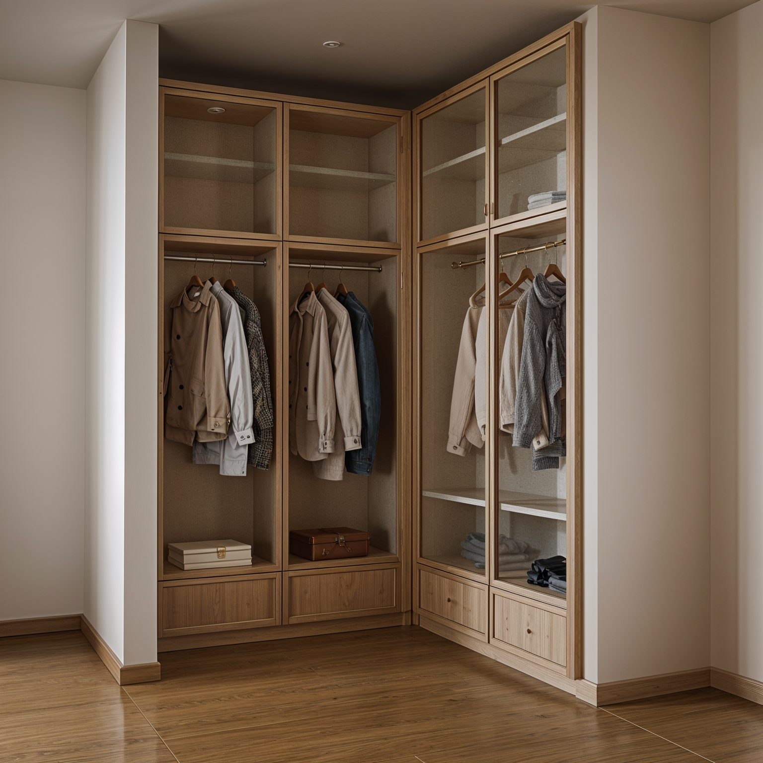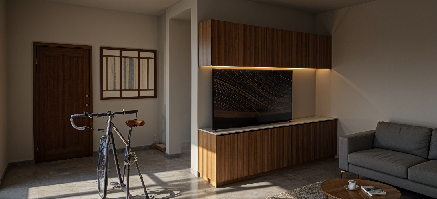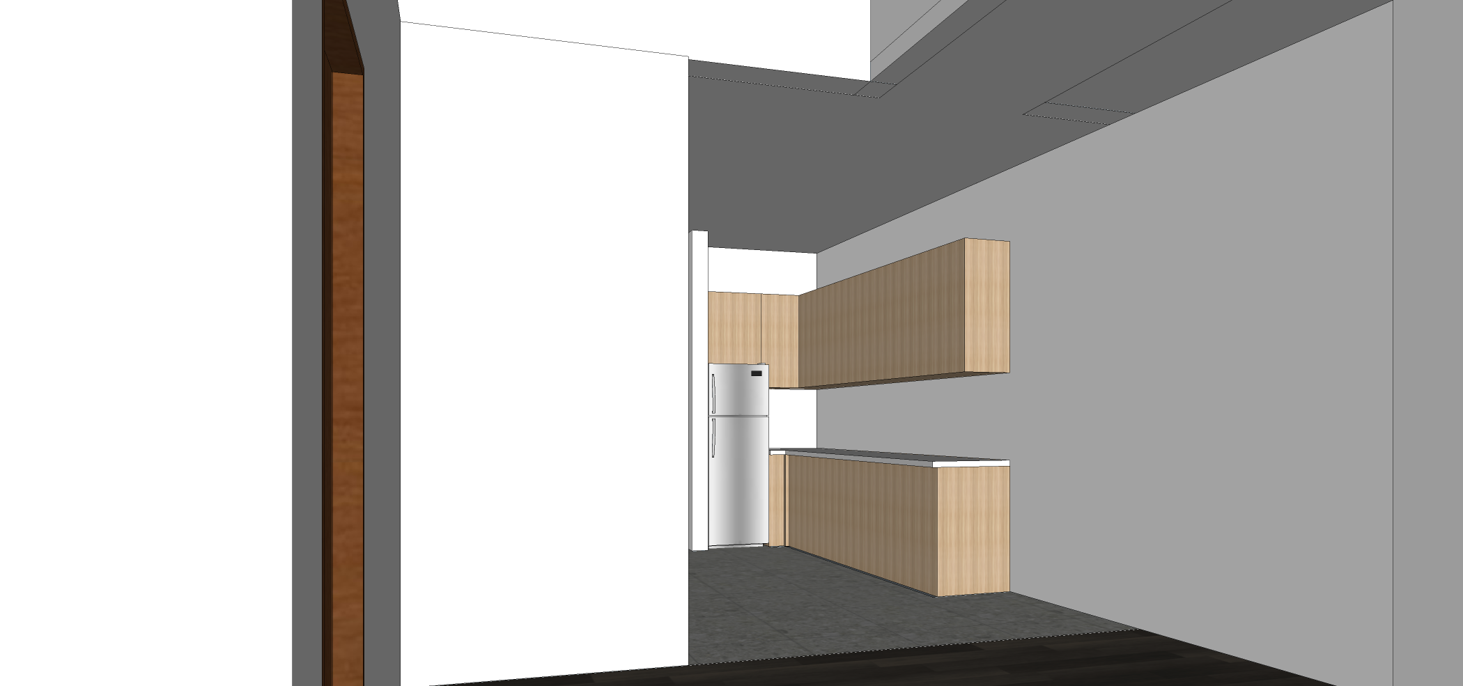 create photorealistic render of this foyer and kitchen area provide natural light from the light well atrium above the foyer maintain colors as much as possible provide warm ambient light and natural light from the windows cabinet is walnut wood and tiles are 60x60 gray concrete tiles do not put cabinet lighting