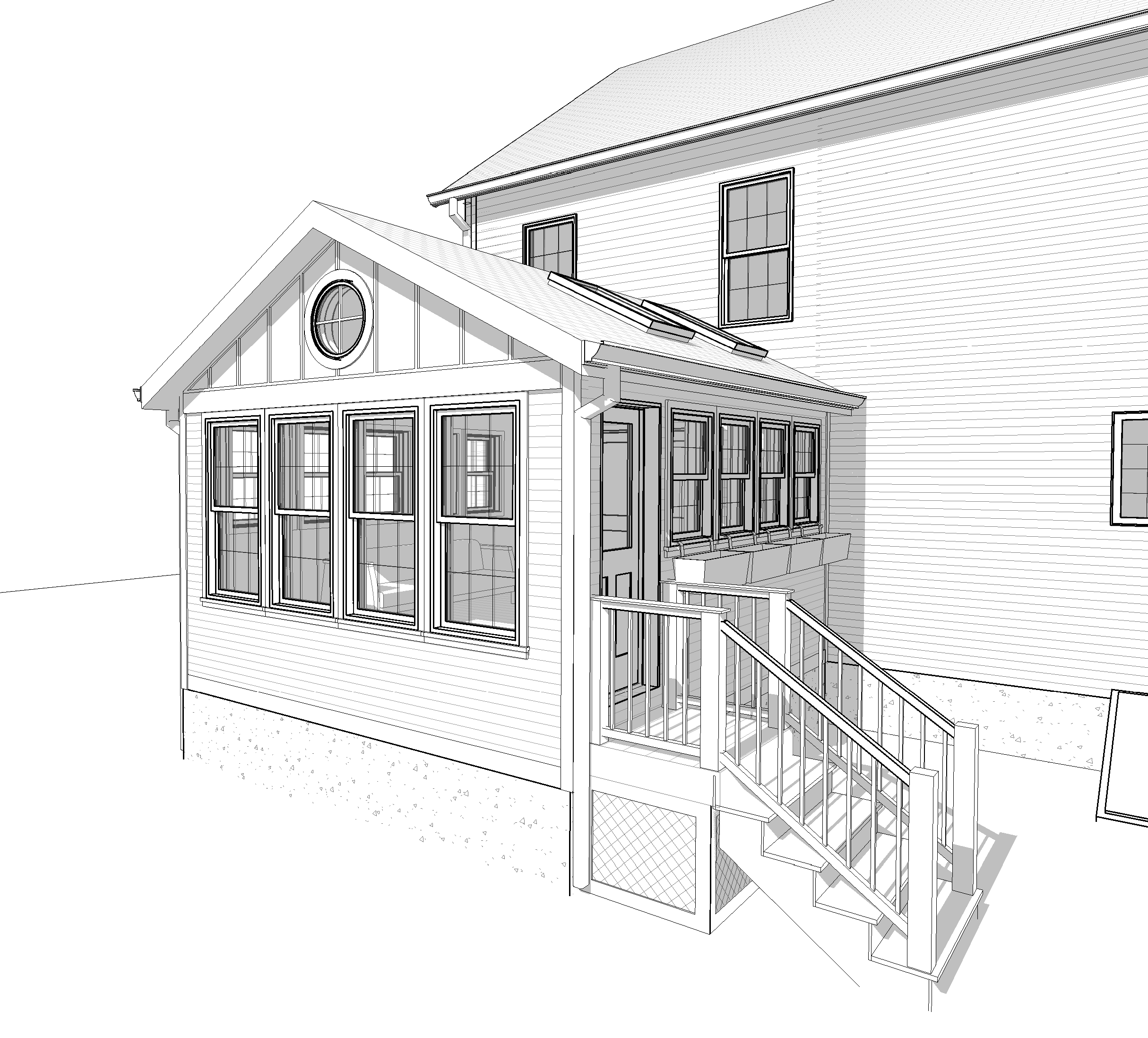 a manicured lawn layered flower beds low maintenance shrubs native plants stone pathway leading to the entrance make the siding a light brown horizontal clapboard and the vertical board and batten a white color make the stairs a dark wood and the railing and balusters white put plantings in front of the 4 windows