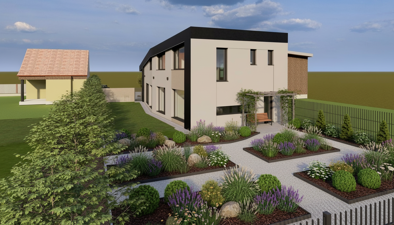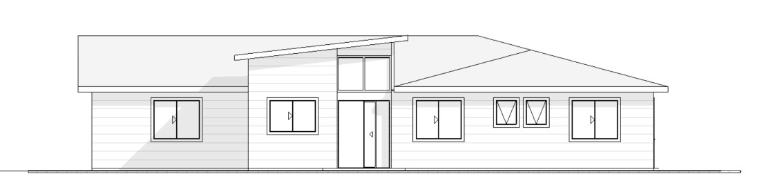 the facade should be weatherboard with paving for parking in front of house the front door should be double glass sliding door with only small shrubs