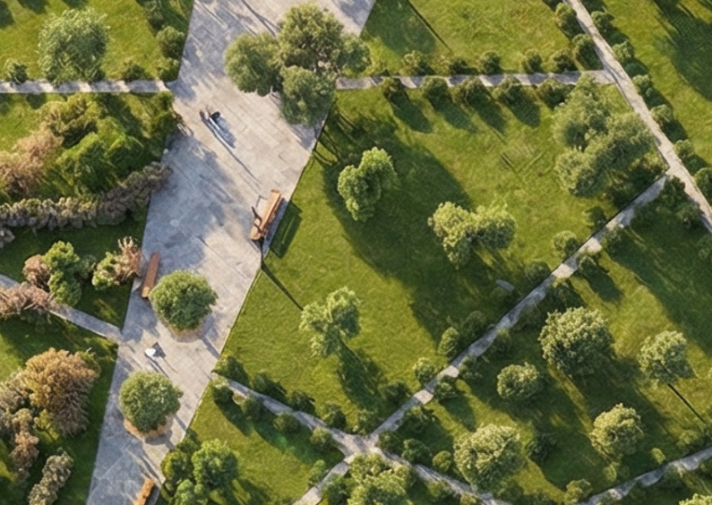 fai una vista render all altezza di un uomo che cammina dentro il parco urbano mantenendo gli alberi e l arredo urbano come panchine persone e lampioni mantieni l assetto della pianta di riferimento