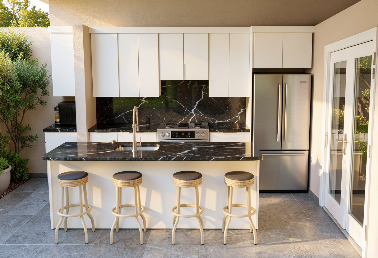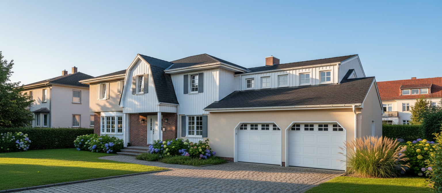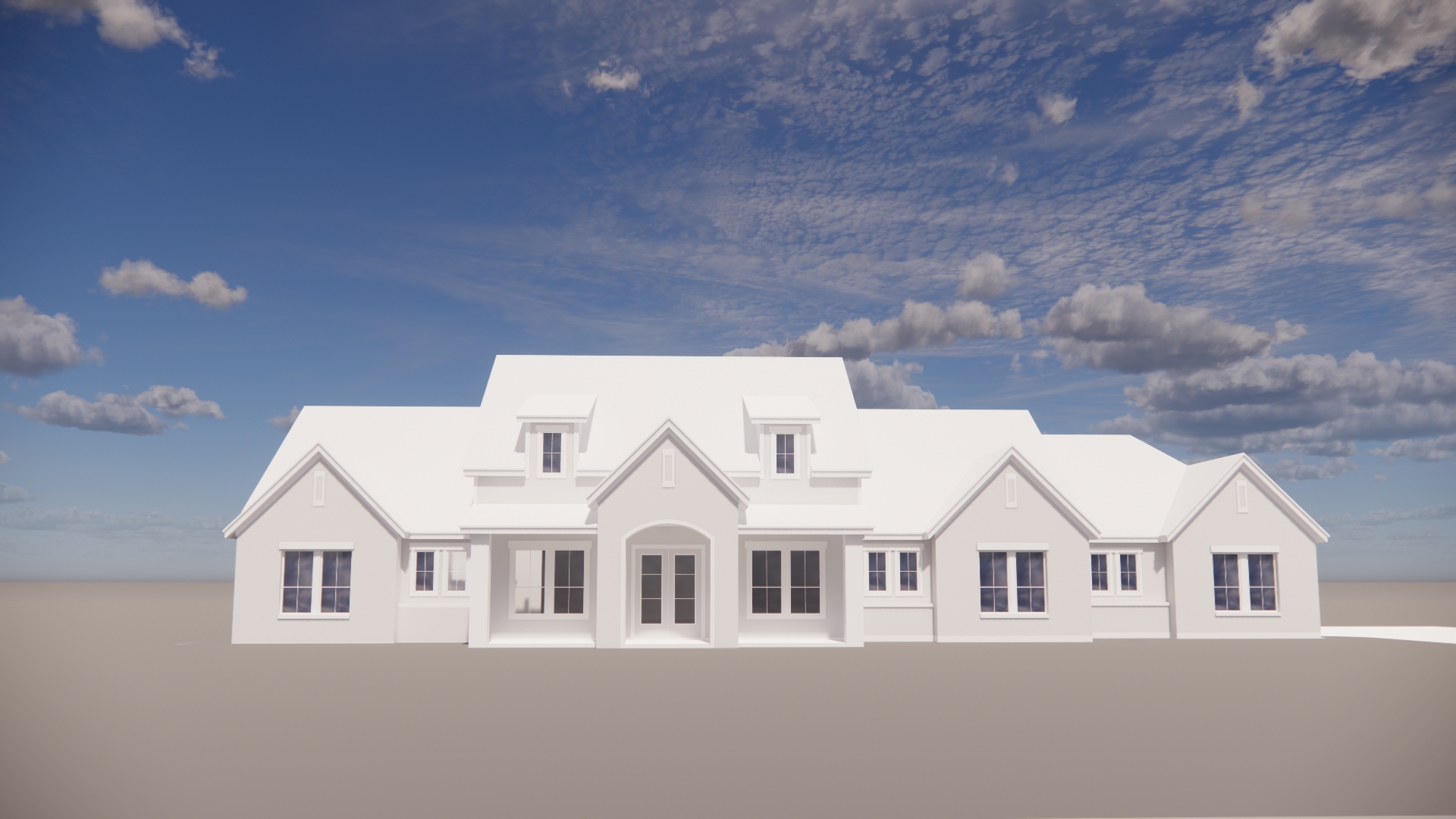 a modern european farmhouse style home with a low wide layout featuring a mix of light stone and dark siding multiple gabled roofs with metal accents and a centered arched entry with warm wood doors the neutral color palette and clean landscaping give it a timeless elegant and inviting look