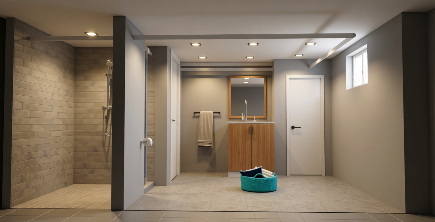 a small modern bathroom the cupboard with the sink is a red classical style cupboard the sink is white the walls have a black textured finish that resembles marble the floor is checkered with black and white tiles the mirror above the sink is a classical style mirror with a detailed gold frame above the mirror there is a modern liniar wall sonce suited for bathrooms the shower is also finished with black textured finish that resembles marble the shower is hidden after the wall with the sink and mirror and is visible on the left side of the room there is a small window on the back wall facing the toilet soft natural daylight enters from the window creating realistic shadows