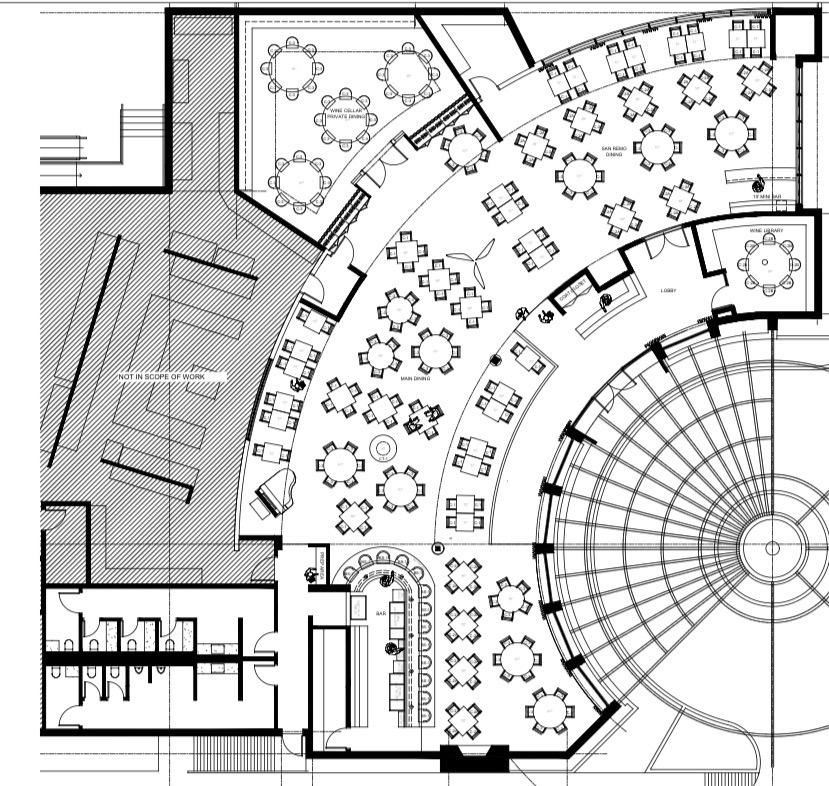 a vibrant and elegant restaurant interior design rendering showcasing a grand circular layout the walls are adorned in a rich cream color providing a warm and inviting atmosphere the tables are set with crisp white linens complemented by chairs in a deep mahogany finish the bar area features a sleek marble countertop with brass accents illuminated by soft warm lighting the open dining space includes a variety of round and rectangular tables arranged thoughtfully for both intimacy and openness large green plants are strategically placed for a touch of nature while circular chandeliers cast a gentle glow throughout the overall ambiance is sophisticated yet welcoming perfect for an upscale dining experience architecture